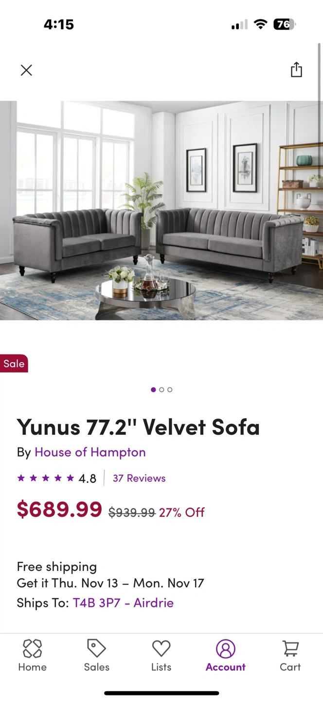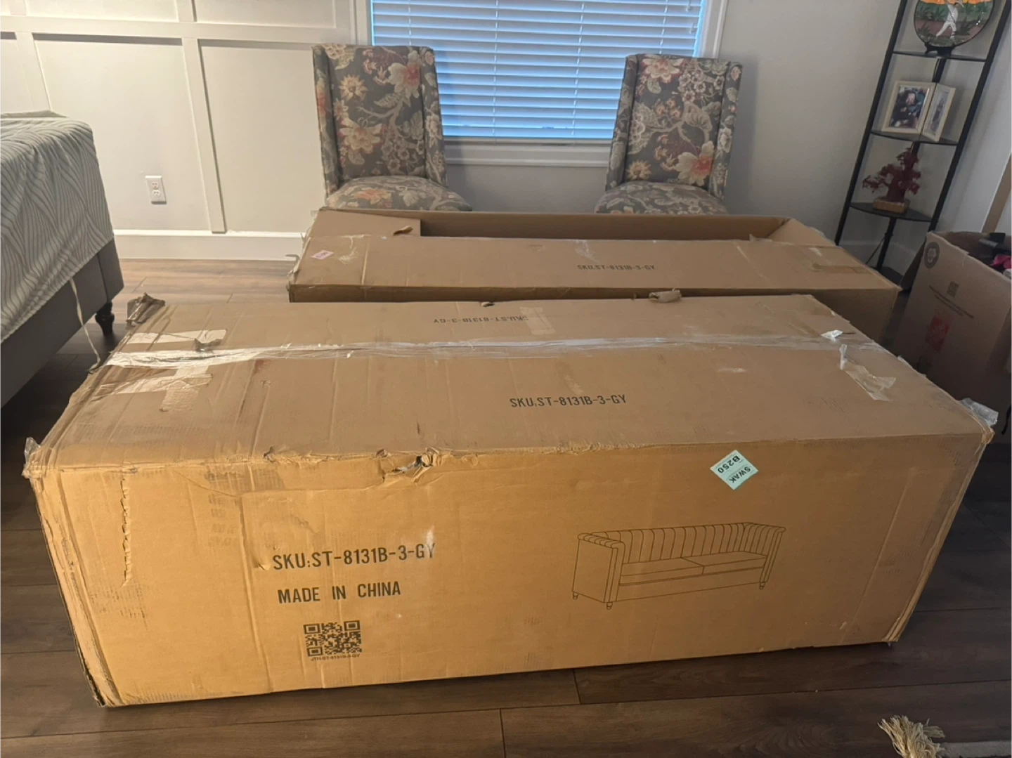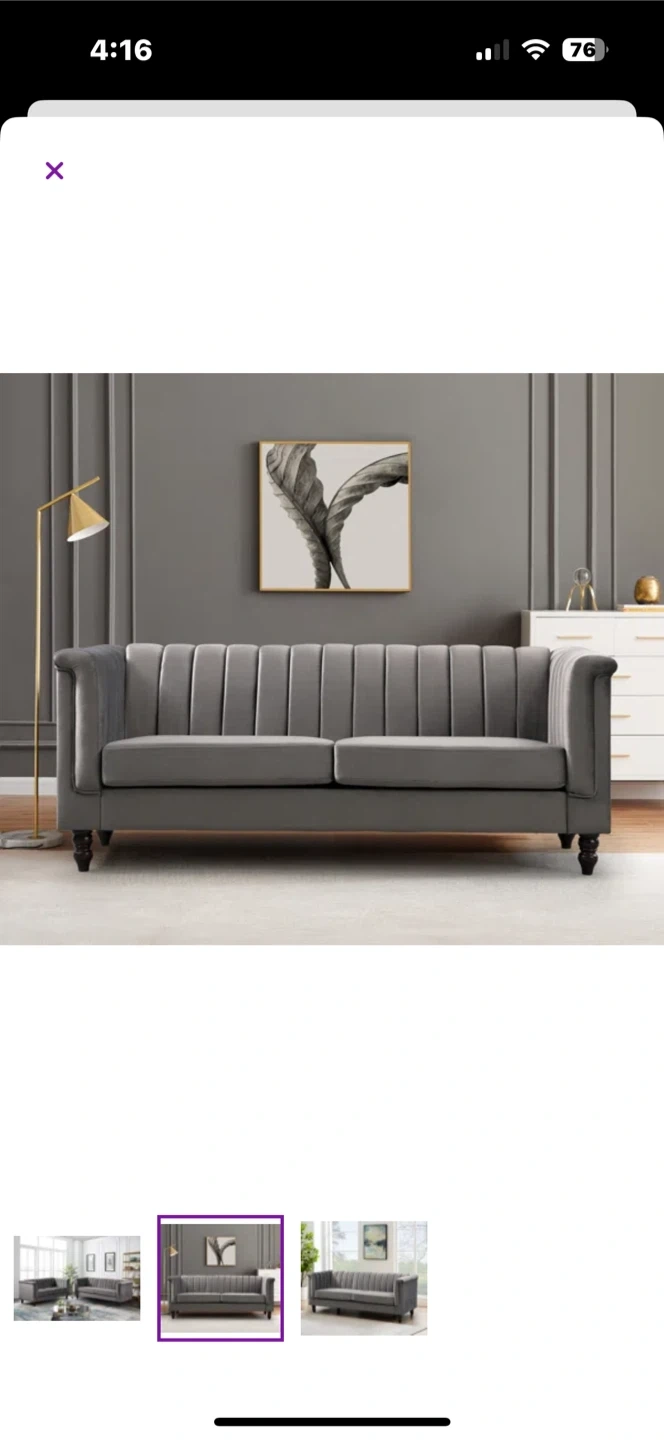 60Selling a brand new beautiful grey velvet sofa from wayfair. I have an extra since I got sent two due to delays. Comes in box, selling it for 189 less. Asking $500 obo, no low balling. Serious buyers only please!