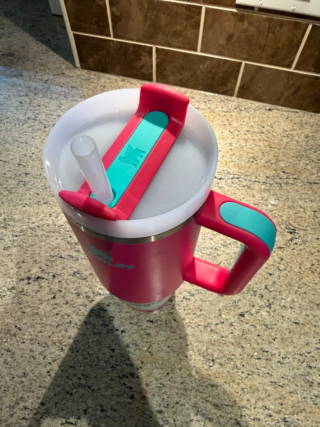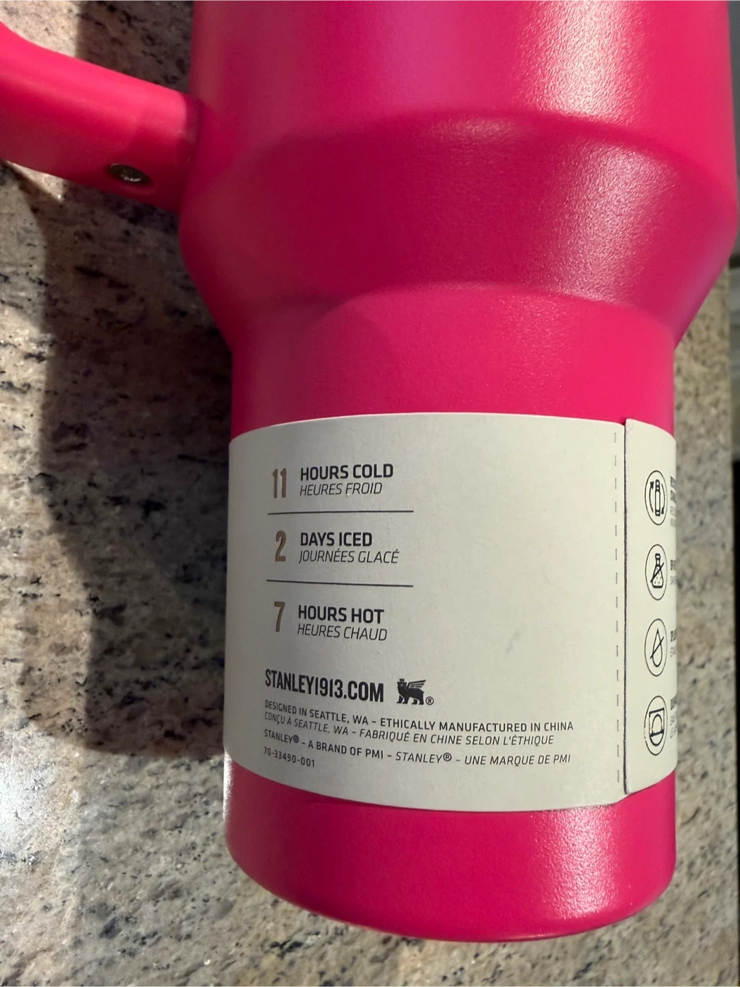 This is a brand new pink Stanley Flowstate Quencher H2.0 Tumbler. It holds 40 oz or 1.18 L and is made of stainless steel. It's BPA-free and splash-proof. This tumbler keeps drinks cold for 11 hours and hot for 7 hours.