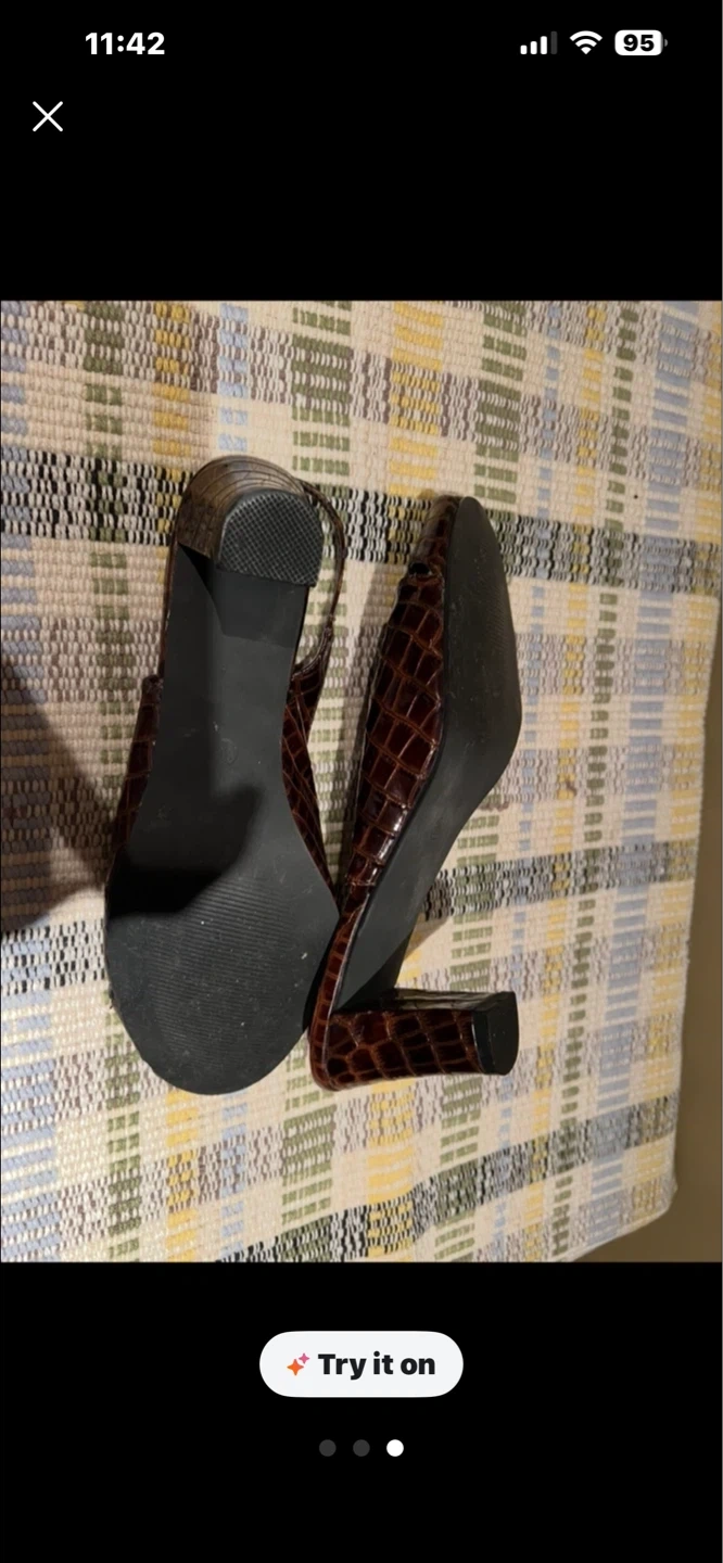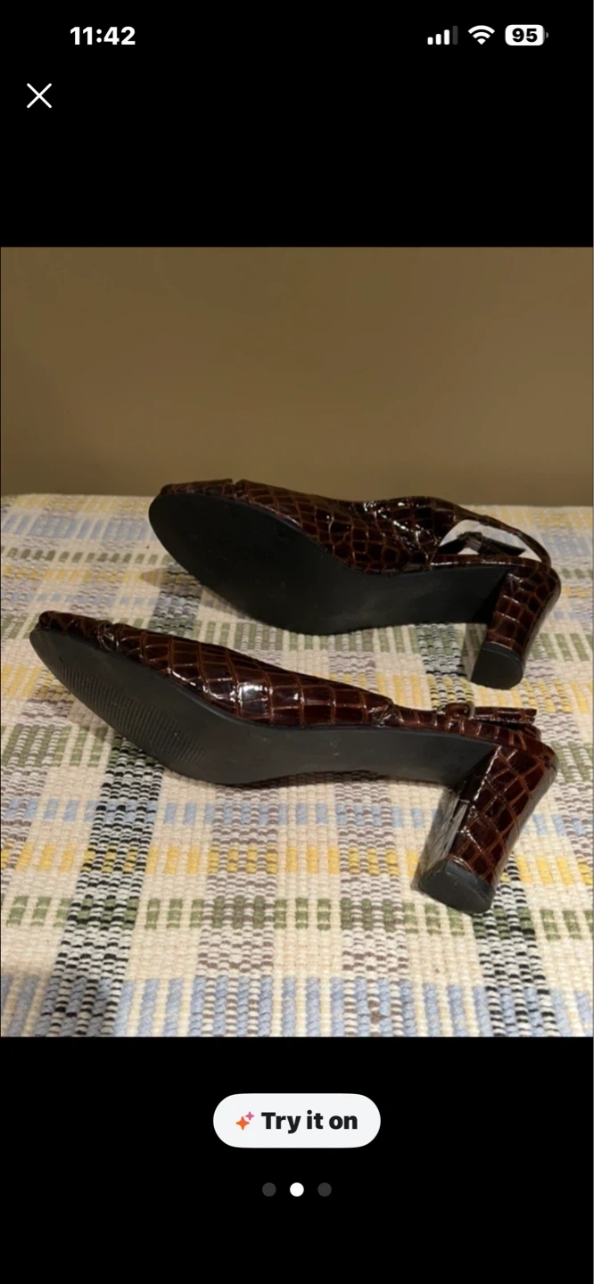Chic slingback heels with a glossy brown crocodile embossed finish. These peep-toe shoes feature a comfortable block heel and adjustable slingback strap. Perfect for dressing up any outfit!