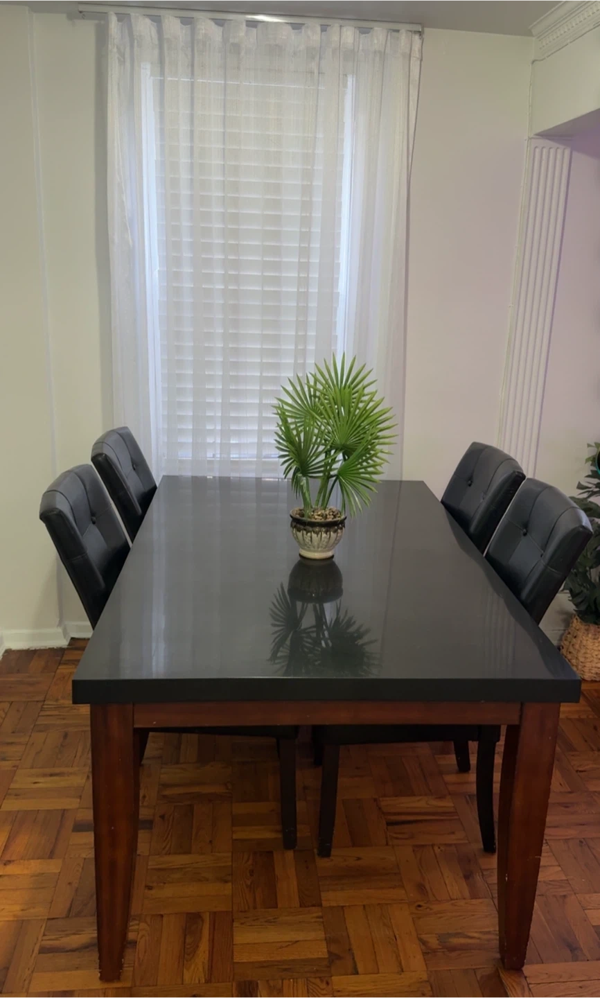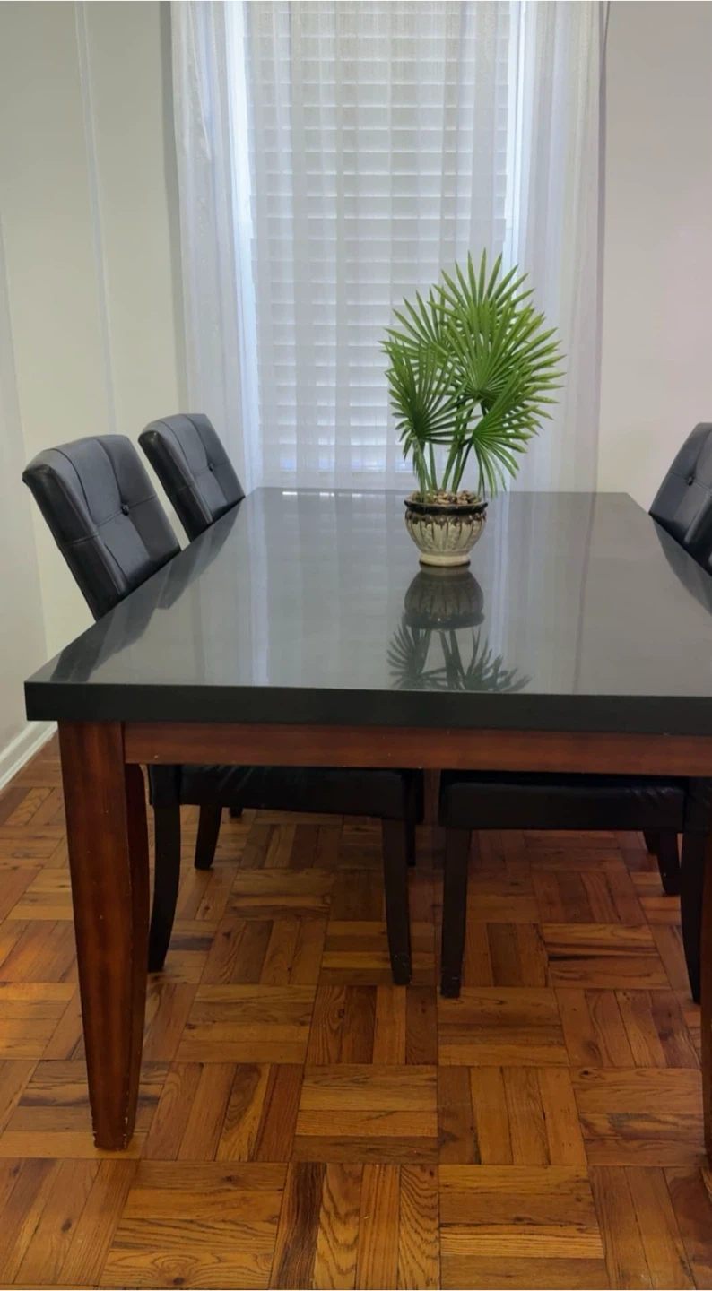 A dark-topped dining table with wooden legs, paired with six black leatherette chairs. Seats six comfortably. Perfect for family meals!