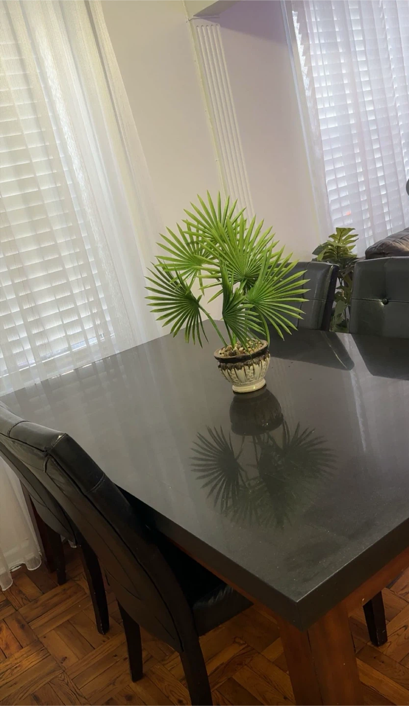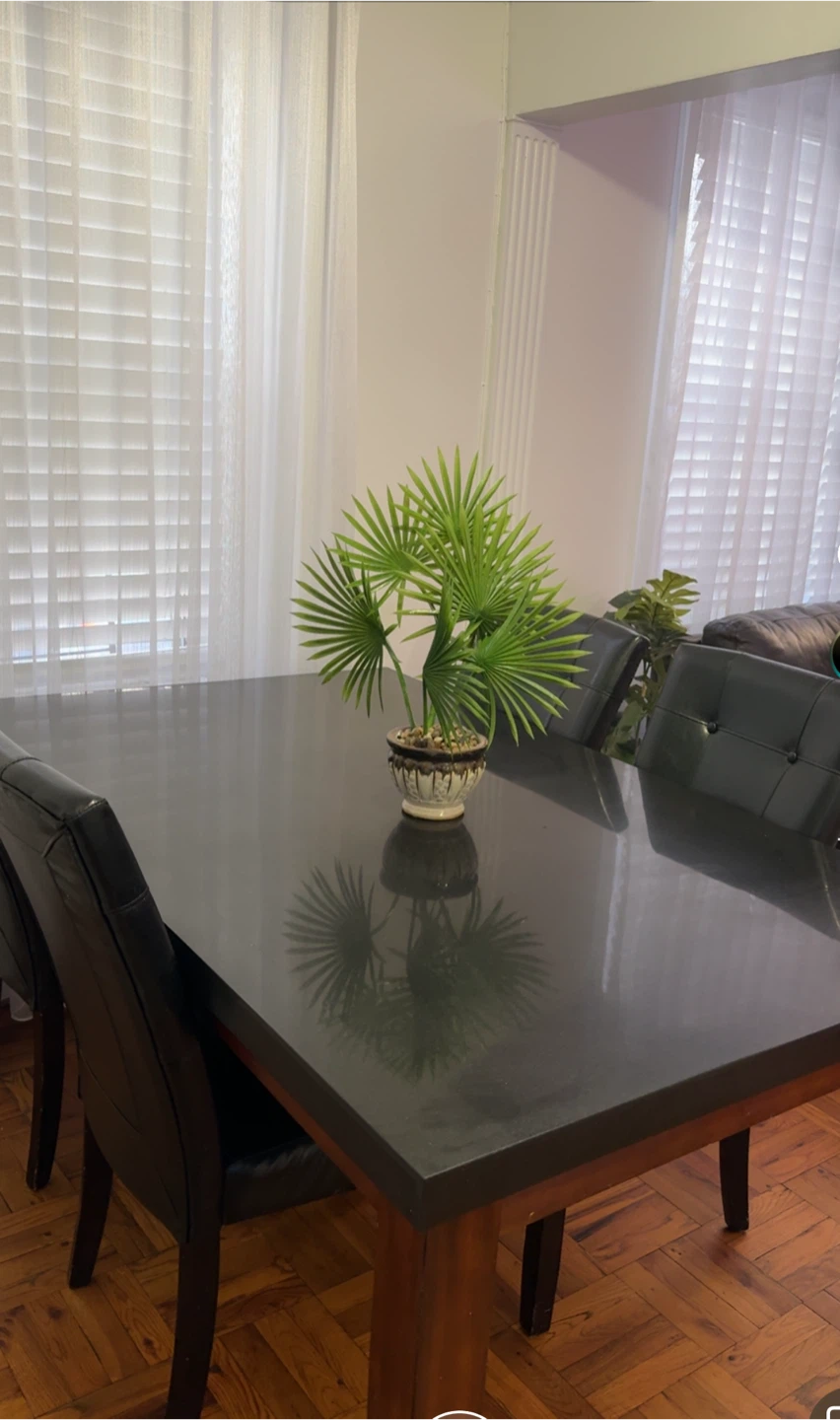 A dark-topped dining table with wooden legs, paired with six black leatherette chairs. Seats six comfortably. Perfect for family meals!