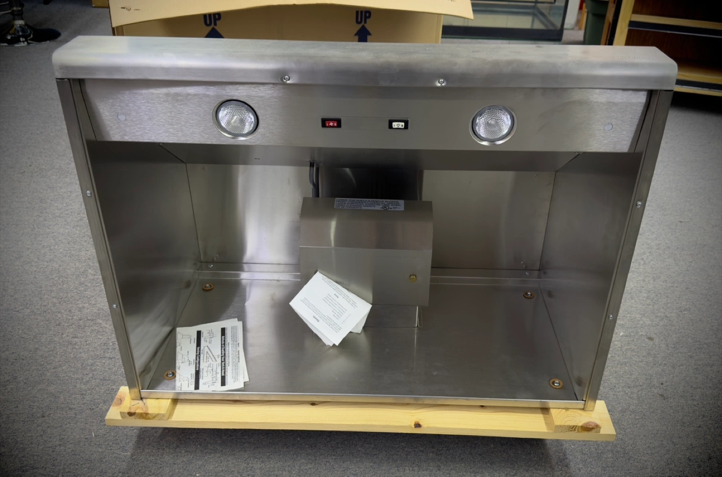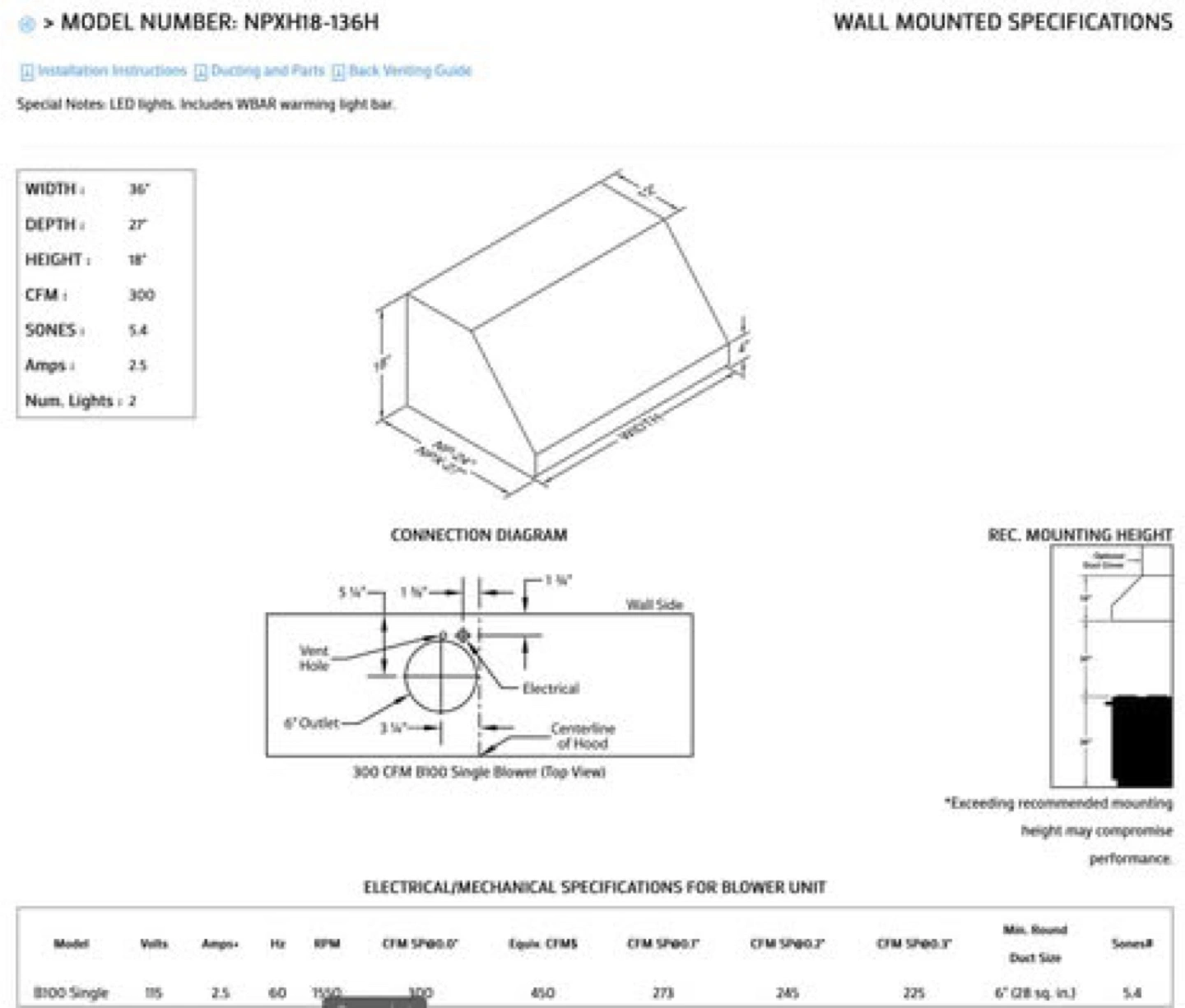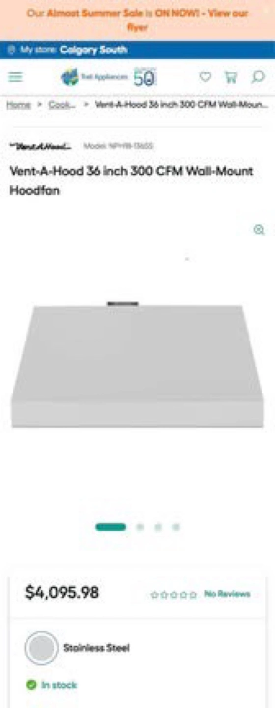 Selling a Vent-A-Hood 36 inch 300 CFM wall-mount hoodfan. It's stainless steel and in great condition. The model number is NPXH18-136H. It's 36 inches wide, 27 inches deep, and 18 inches high Retail $4095.00 New never installed