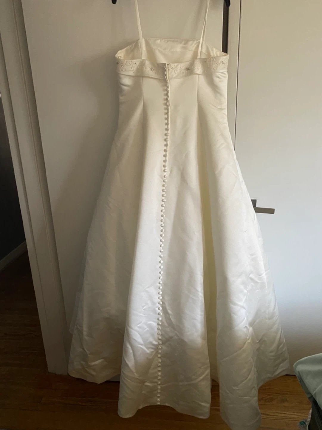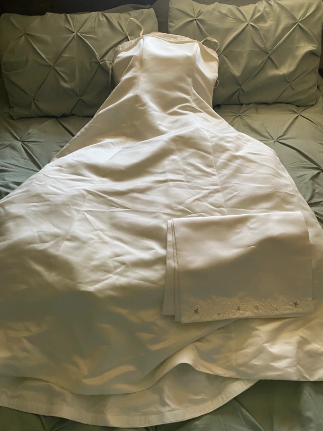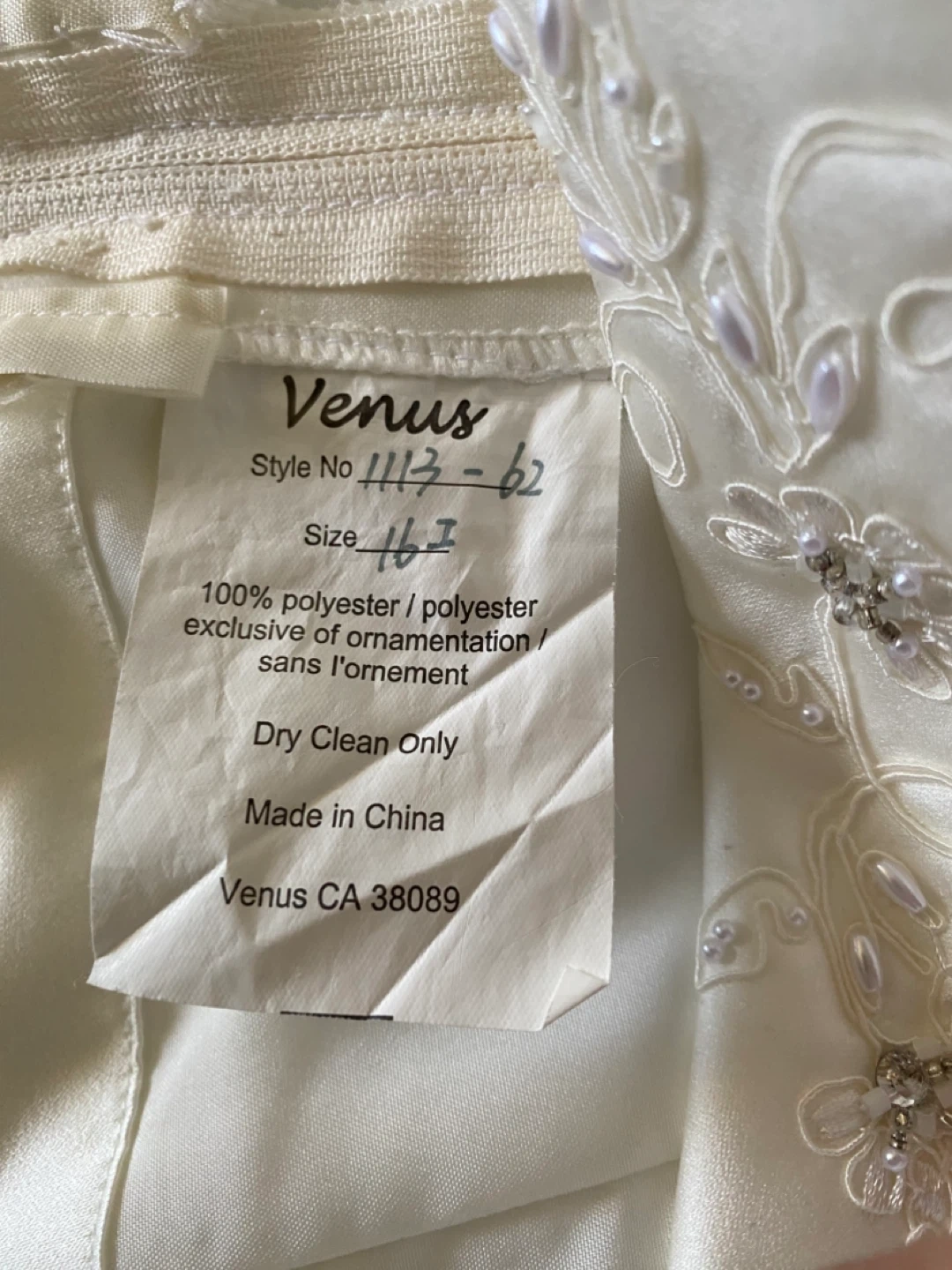 Selling a beautiful Venus wedding dress. It's a size 16 and made of 100% polyester. The style number is 1113-62. It's been professionally dry cleaned and is ready for its next big day!