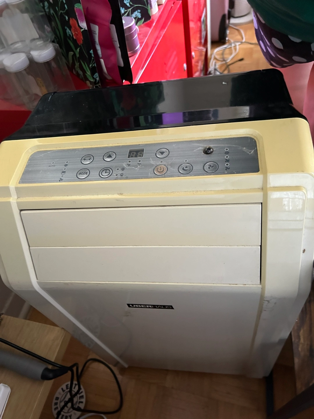 Air conditioner with a white and black exterior. It features several buttons and a display. The image also includes accessories and parts. It needs a drip tray to catch the water.