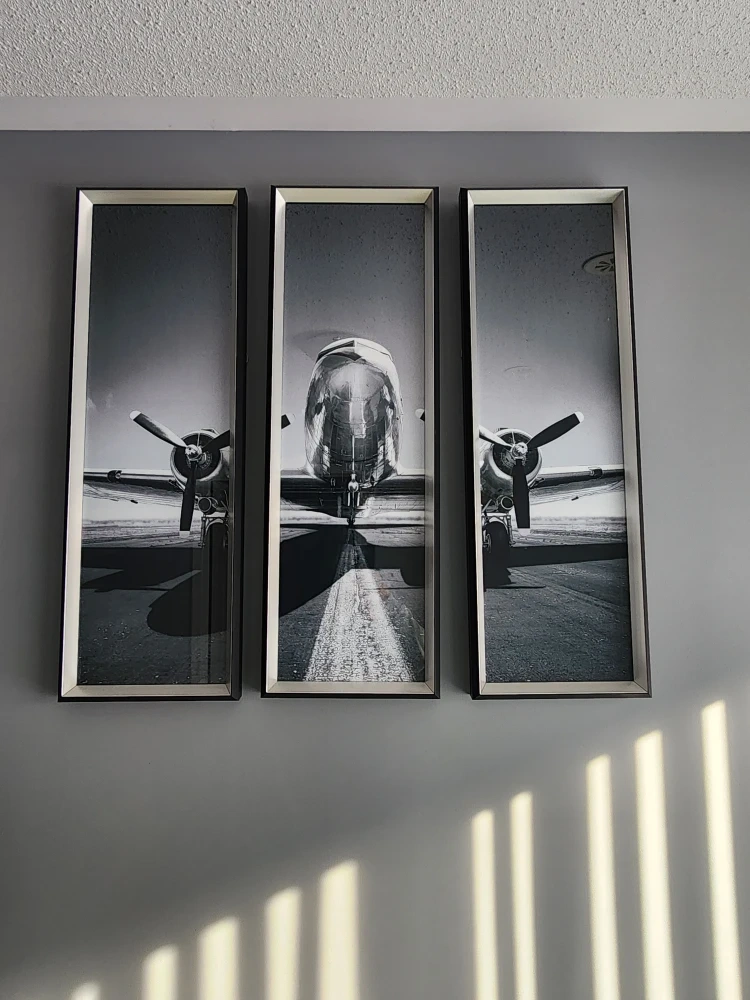 This is a set of three framed prints featuring black and white photographs of an airplane on a runway. The art is vertically oriented and framed in black with a white matting. Adds a bold, graphic statement to any wall!