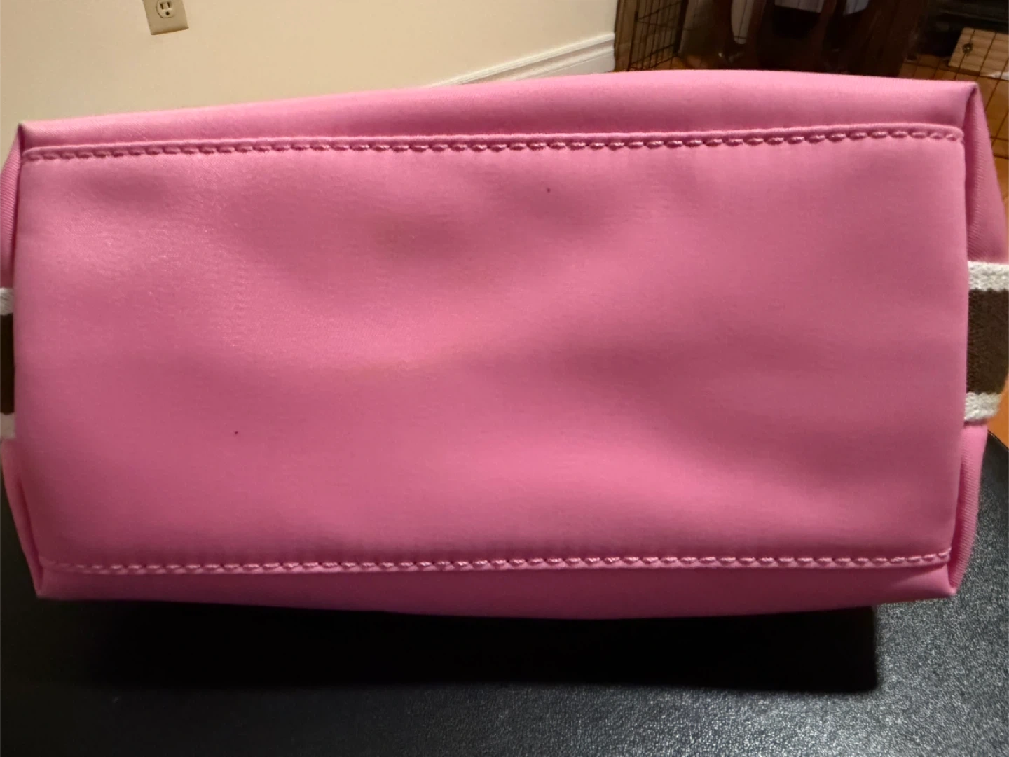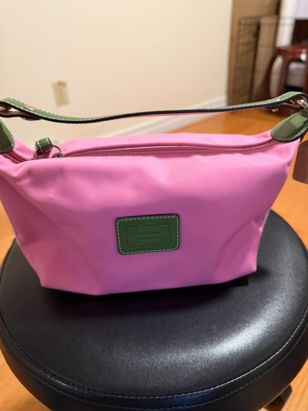 This is a Coach shoulder bag with pink nylon and green leather trim. It features the signature Coach 'C' pattern on the interior lining. Zip-top closure.