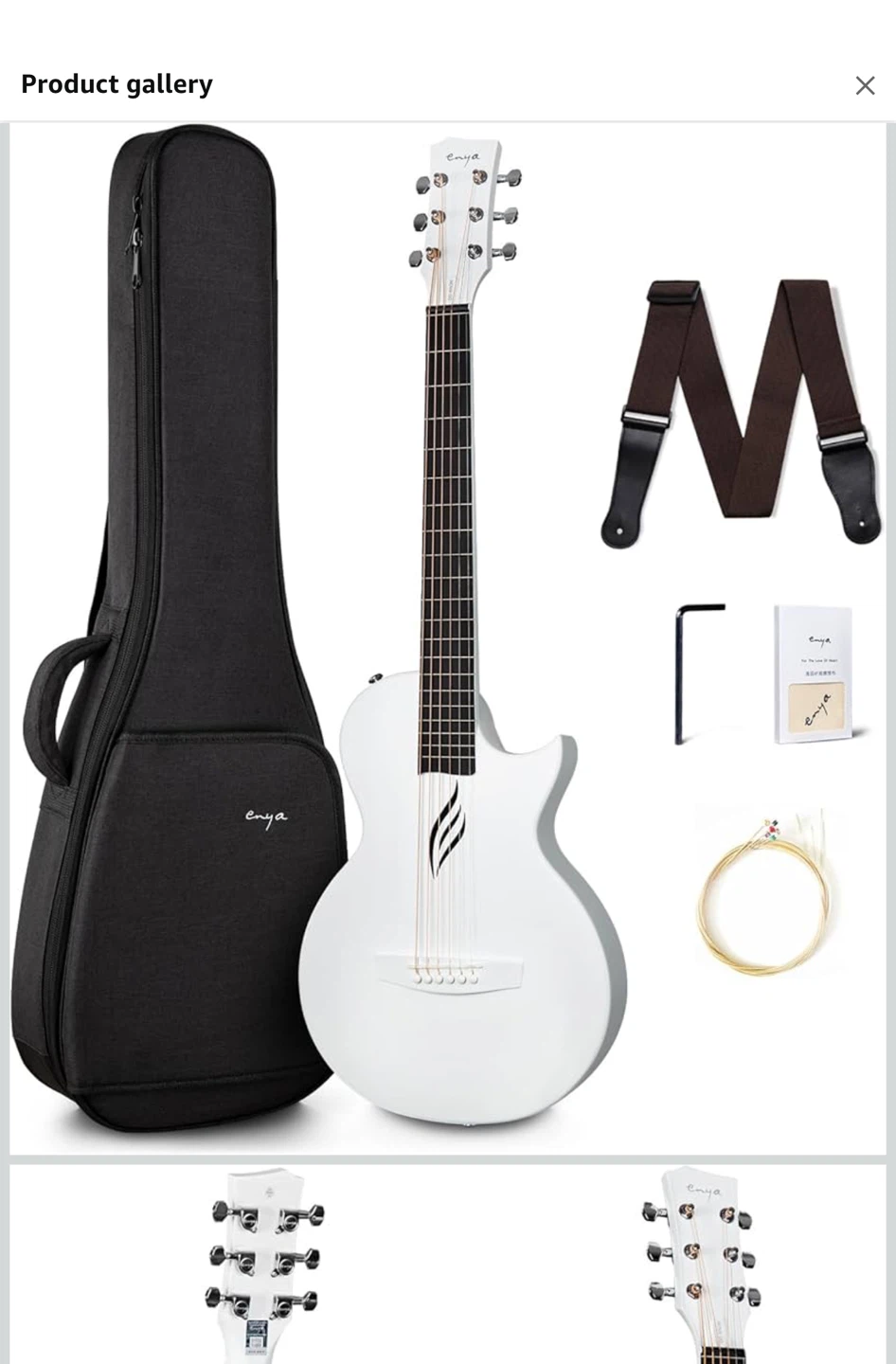 Selling an Enya acoustic guitar in white. It comes with a case, strap, wrench, strings, and a manual. Great for beginners or anyone looking for a stylish guitar!