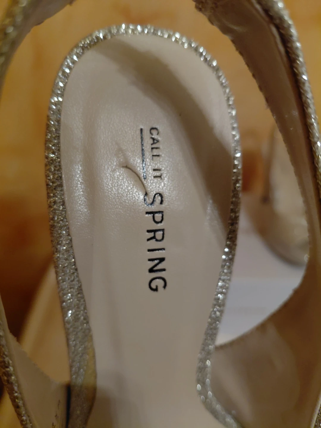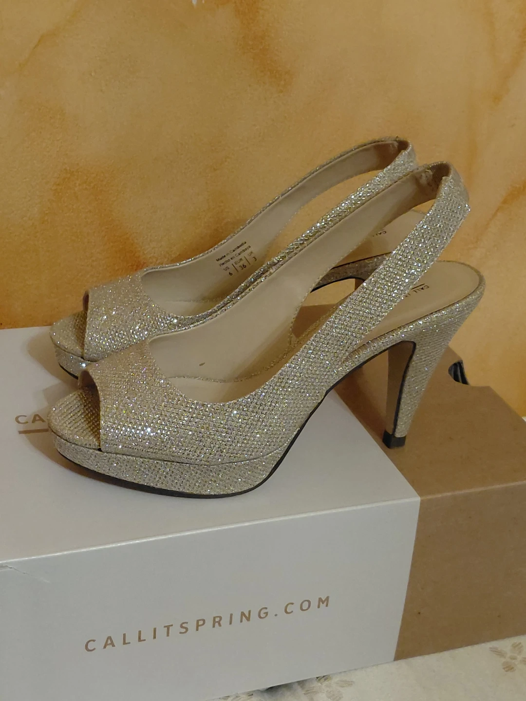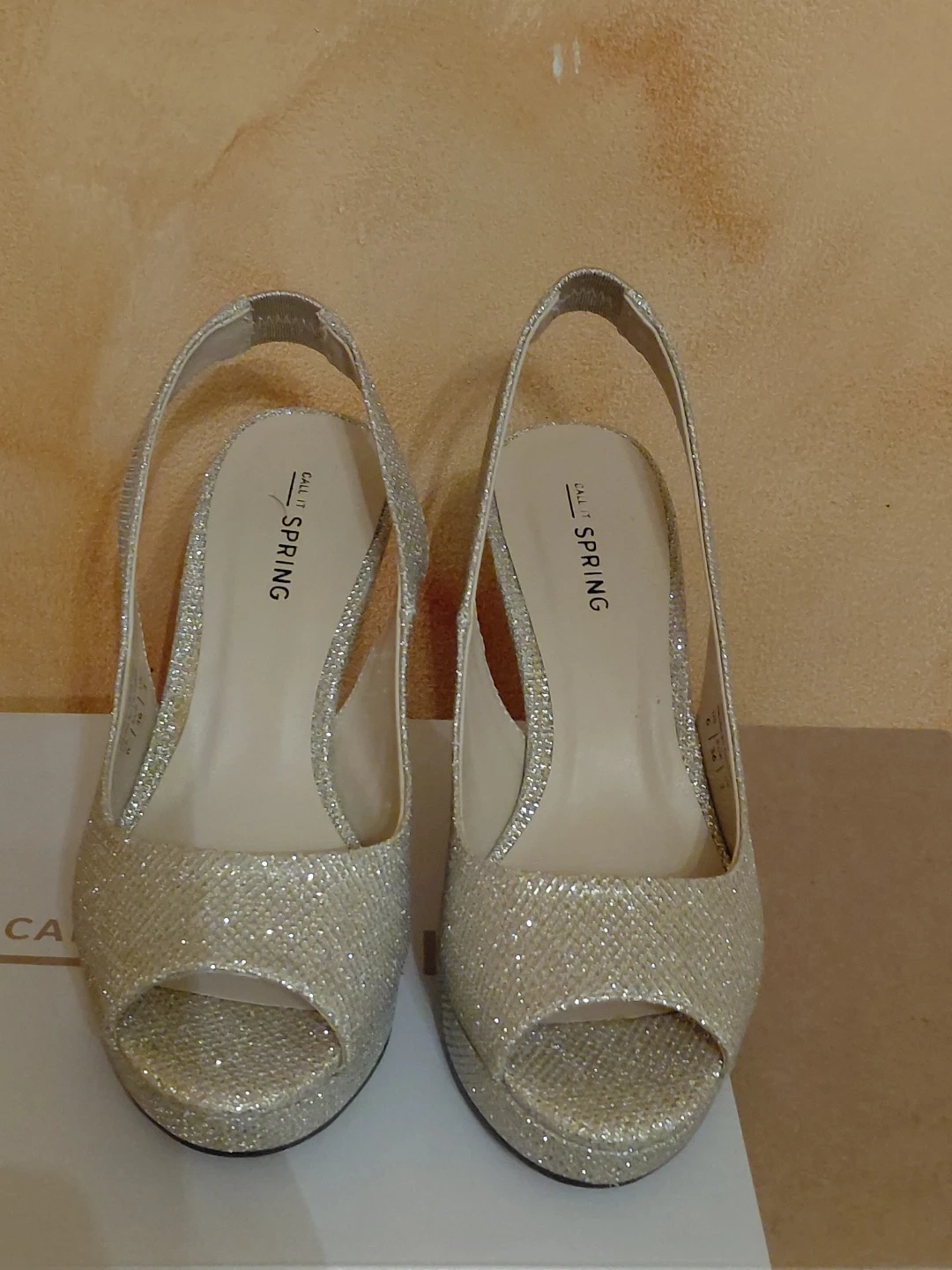 These Call It Spring slingback heels feature a sparkly silver glitter finish and an open toe design. They have a platform sole and a comfortable heel height. These heels are perfect for dressing up an outfit for a special occasion!