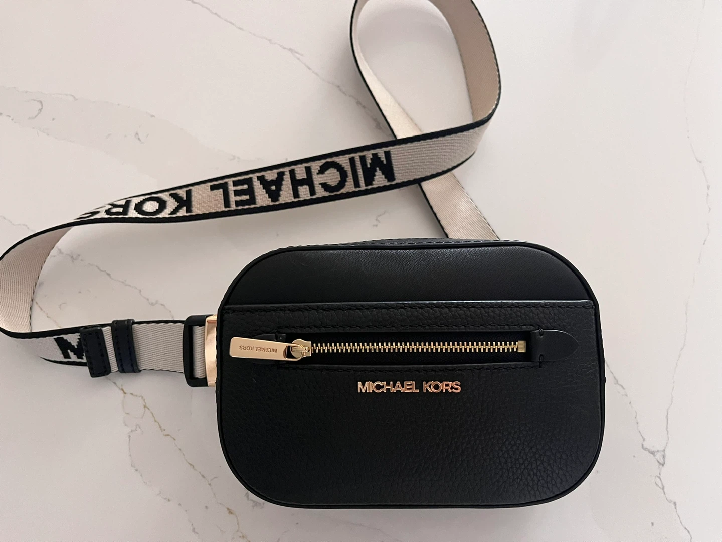 This Michael Kors belt bag is made from black pebbled leather. It features a zip-around closure and an adjustable strap with the brand's logo. The interior has card slots for organization.