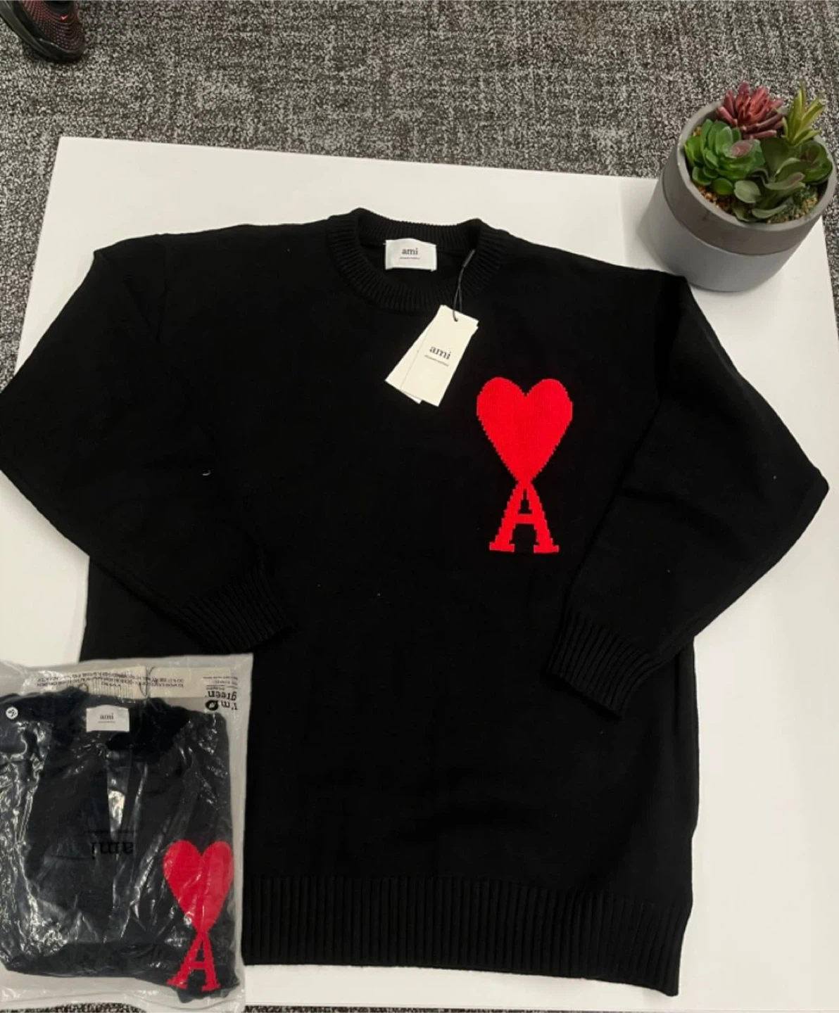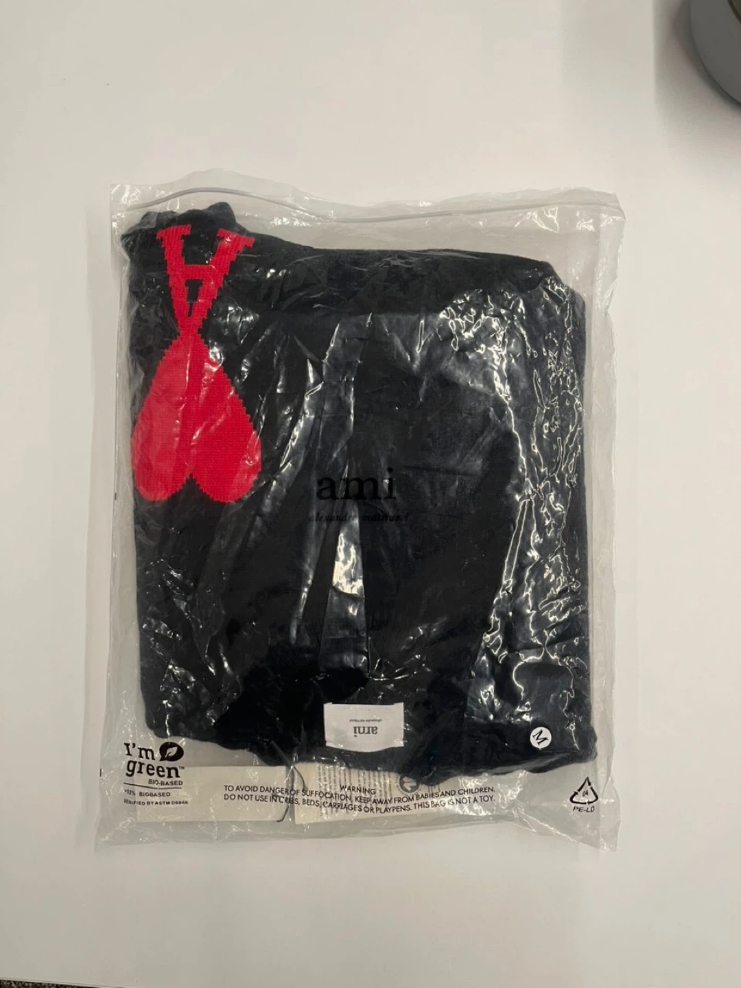 This is a brand new black AMI Paris sweater featuring the iconic red Ami de Coeur logo. It's made from high-quality material and comes in its original packaging. A stylish addition to any wardrobe!