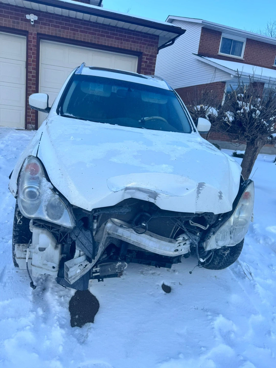 This is a white Infiniti EX35 that's been in an accident. The front end sustained significant damage, and the airbag has deployed. It's being sold as-is, suitable for parts or repair for someone with the right expertise. All major components are still attached to the frame.