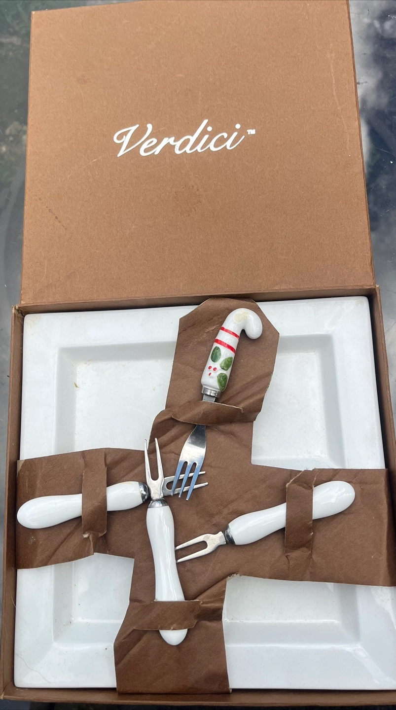 58New in box, Verdici cheese serving set. Includes a square white serving plate and three serving forks with ceramic handles. One fork has a unique design.
