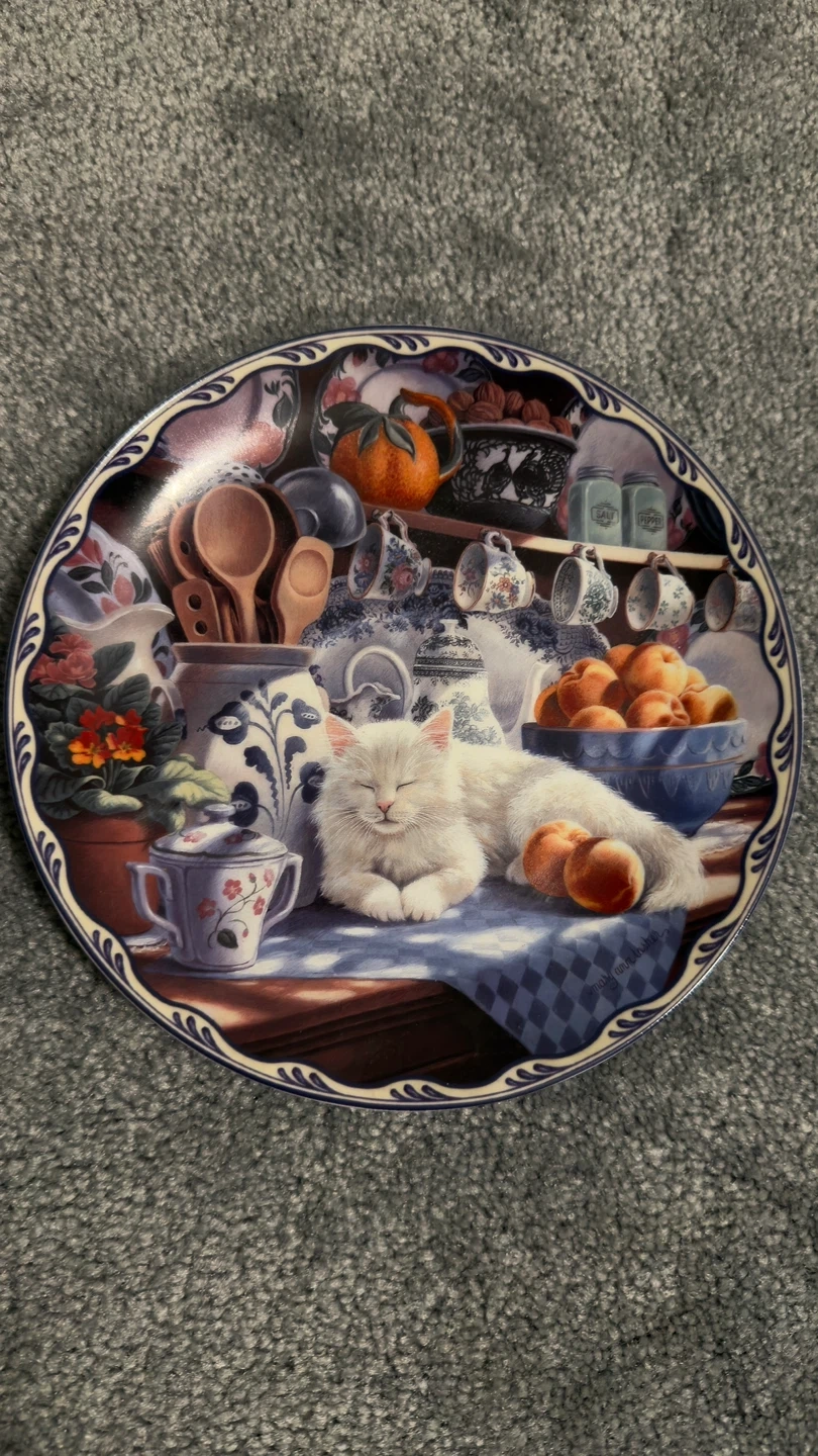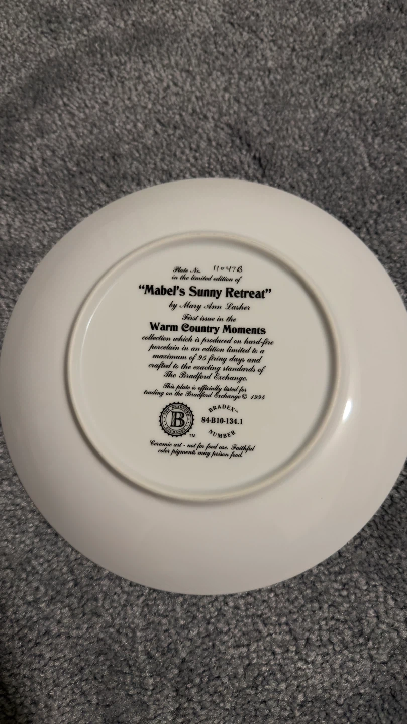 Selling a collector plate titled "Mabel's Sunny Retreat" by Mary-Ann Lasher. It's part of the Warm Country Moments collection. The plate is produced on hard-fire porcelain and is part of an edition limited to a maximum of 95 firing days. Crafted to exacting standards of the Bradford Exchange.