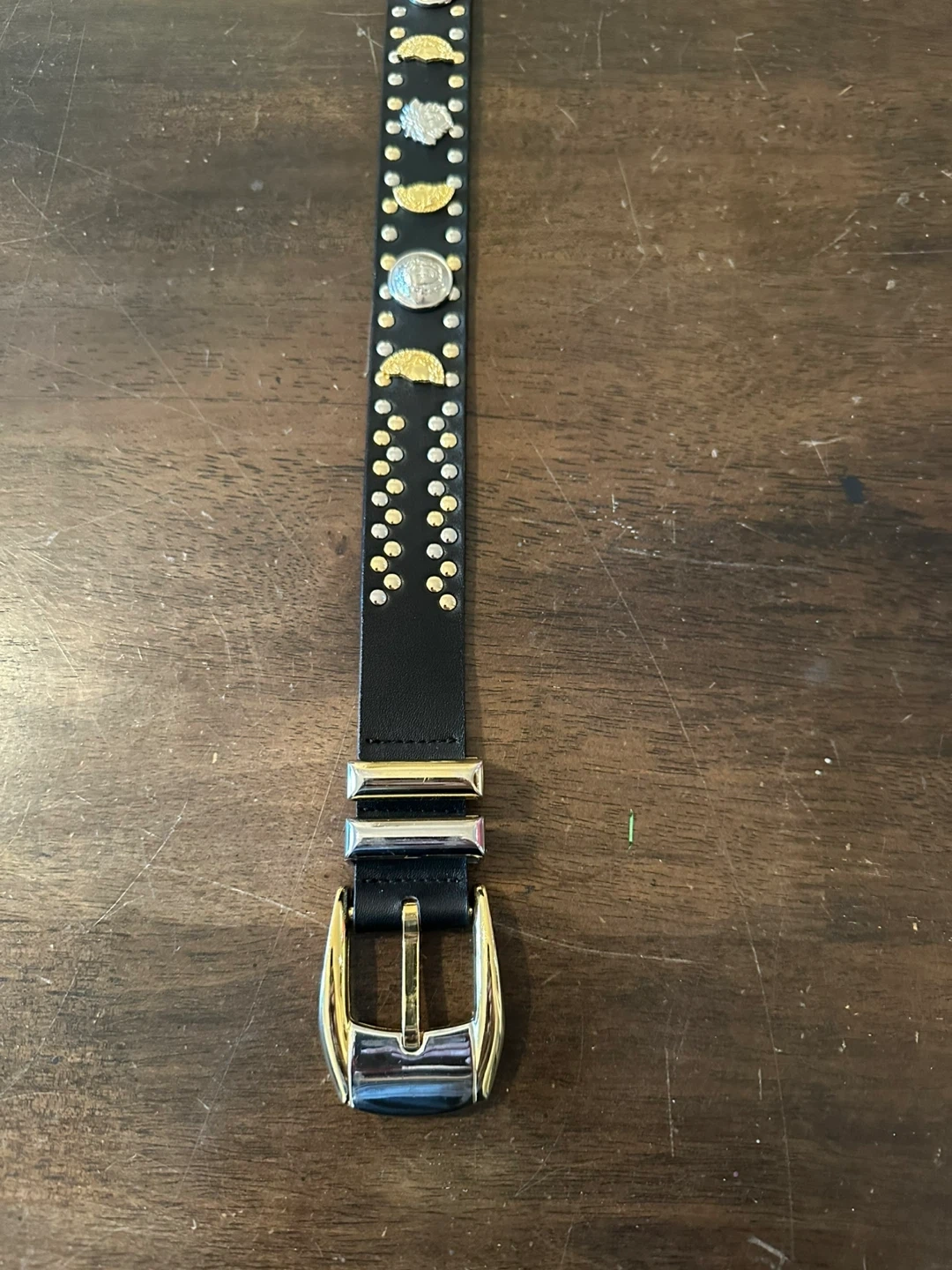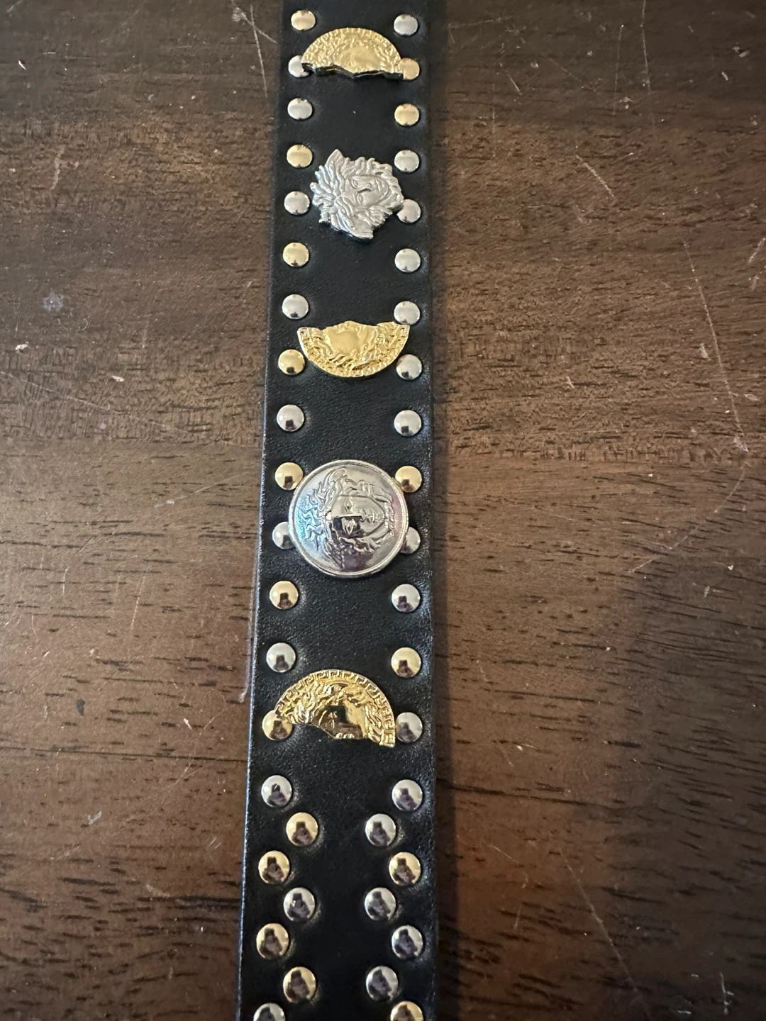 10Selling a stylish Vintage Versace belt in black leather. It features decorative silver and gold-tone accents. The size is 85.