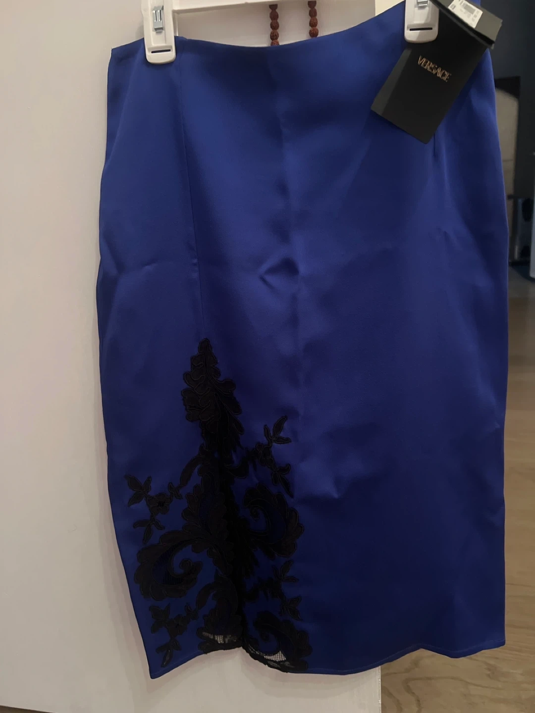 A stylish Versace skirt in a vibrant blue colour! Features a sleek design with subtle detailing, perfect for adding a touch of elegance to any outfit Waist 65 Cm
