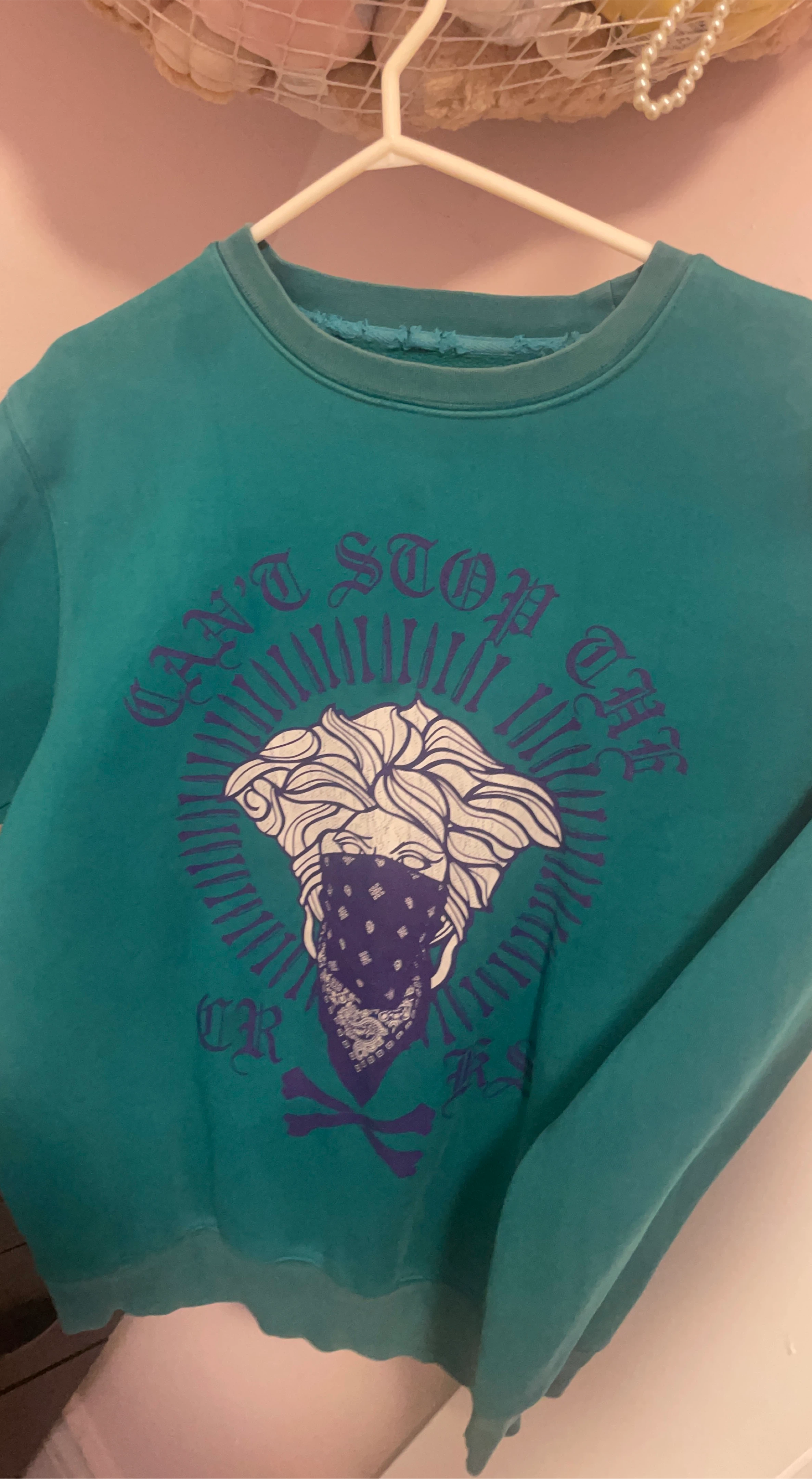 Selling a teal Versace sweatshirt with a cool graphic design! It features the iconic Medusa head with a bandana and the words "Can't Stop The Rock". The sweatshirt is in good used condition and ready for a new home