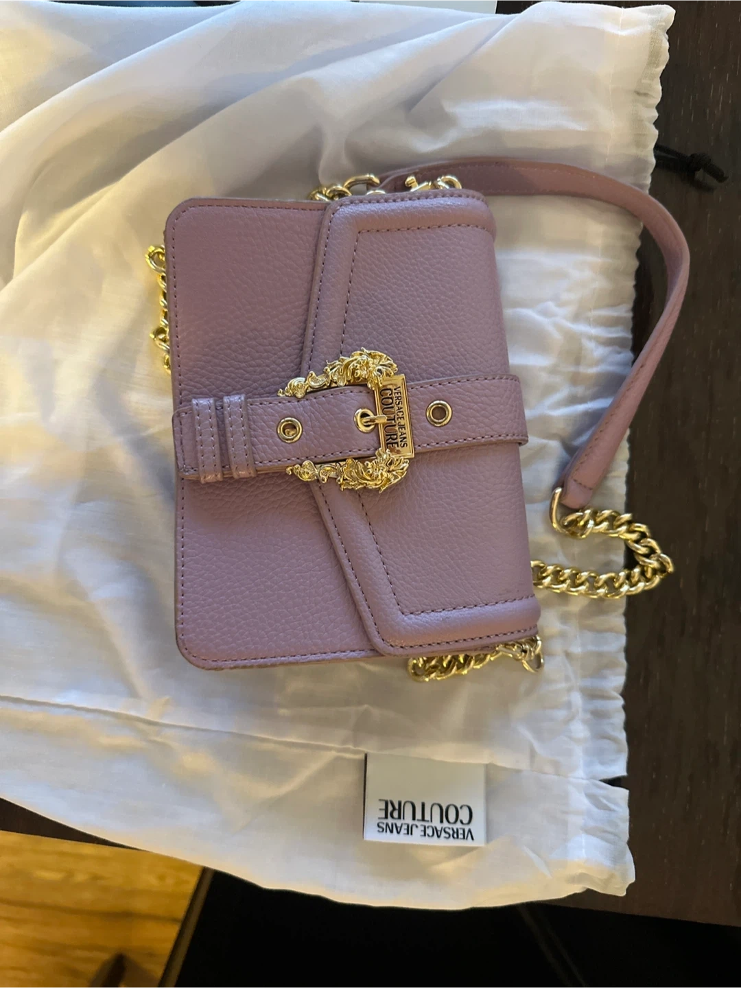 102Selling a Versace Jeans Couture shoulder bag in a beautiful lilac colour. It has a gold chain strap and buckle detail. Comes with the original dust bag!
