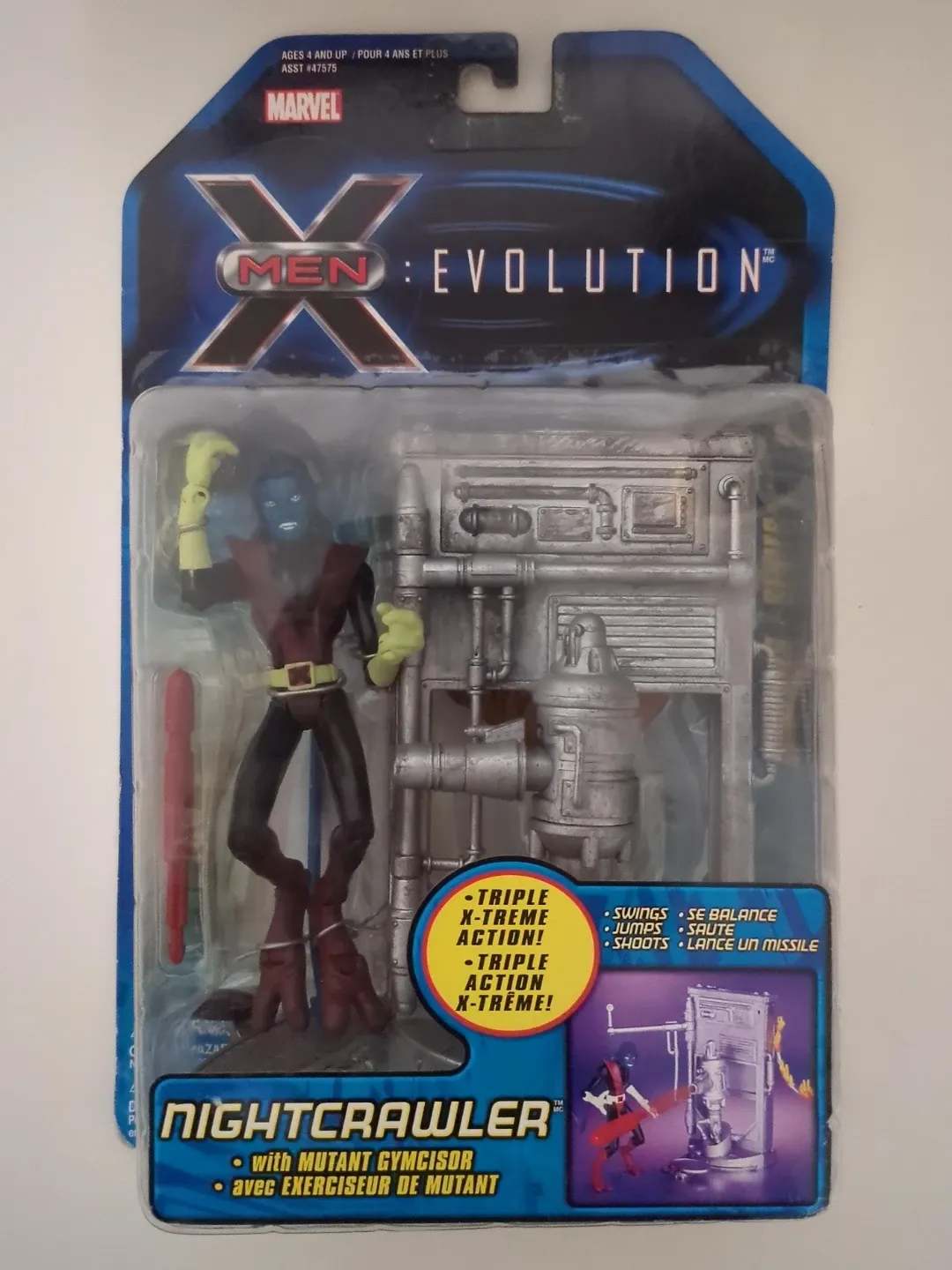 Marvel X-Men Evolution Nightcrawler action figure. It comes with a Mutant Gymcisor accessory. Suitable for ages 4 and up.