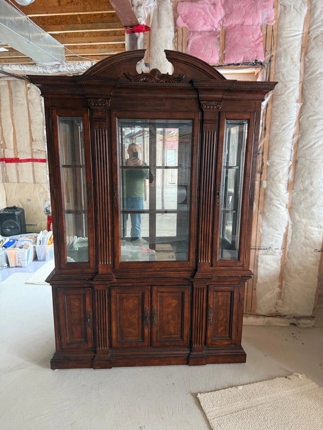 Selling a dark brown wood china cabinet. It features glass doors on the upper section and wooden doors on the lower section. It has a classic and elegant design, perfect for displaying your favourite items!