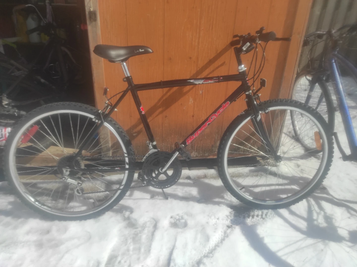 This is a black Supercycle mountain bike. It has a durable frame and is ready for your next adventure. The bike is suitable for riding on various terrains. In good condition, stood in the garage all winter.