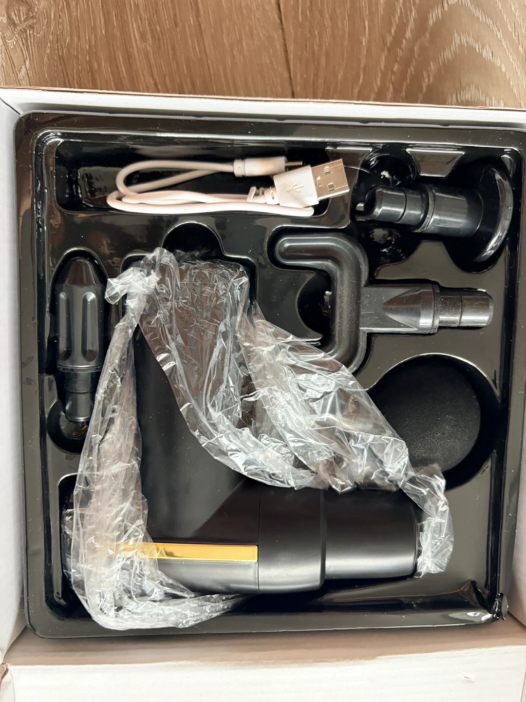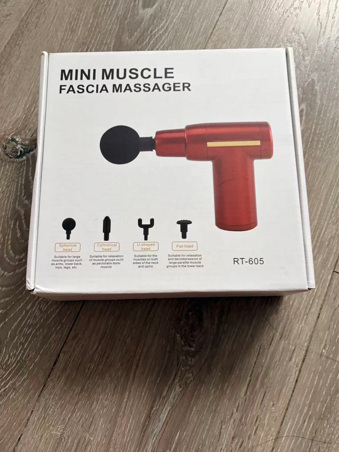 This is a mini muscle fascia massager, model RT-605. It comes with a spherical head, cylindrical head, U-shaped head, and flat head. Includes USB charging cable.
