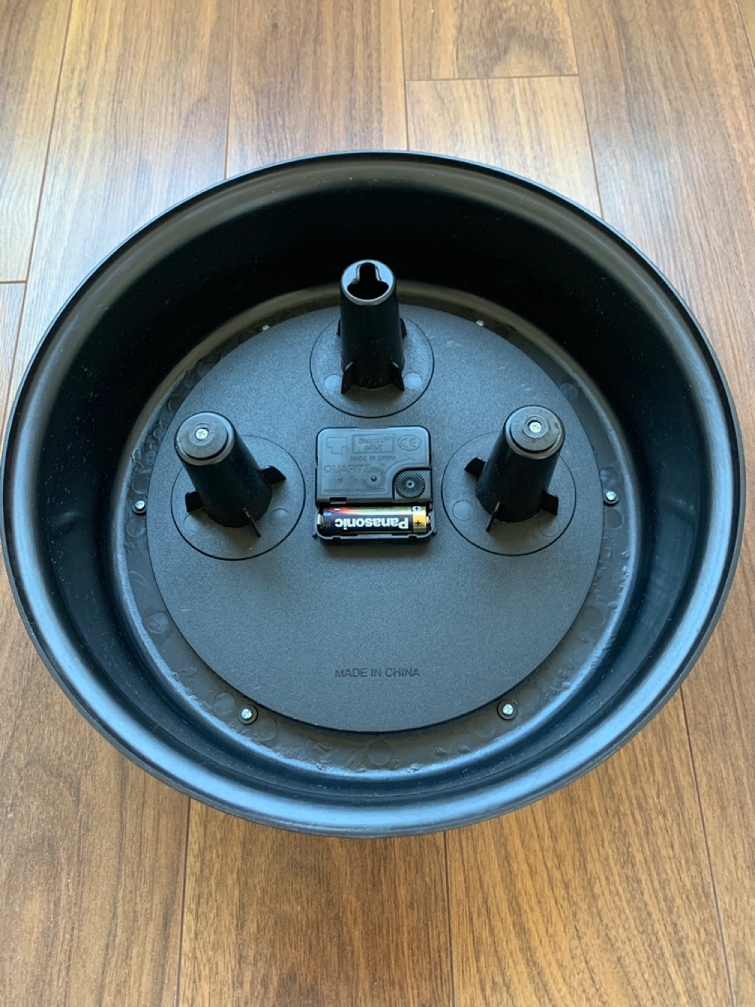Red and silver wall clock. Quartz, runs on one AA battery.