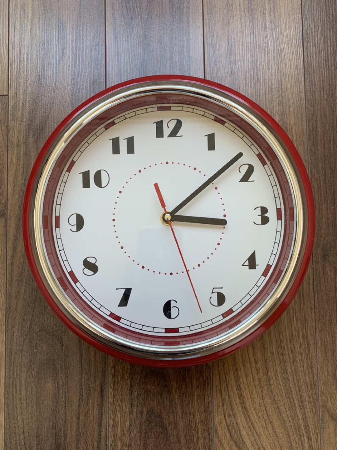 Red and silver wall clock. Quartz, runs on one AA battery.