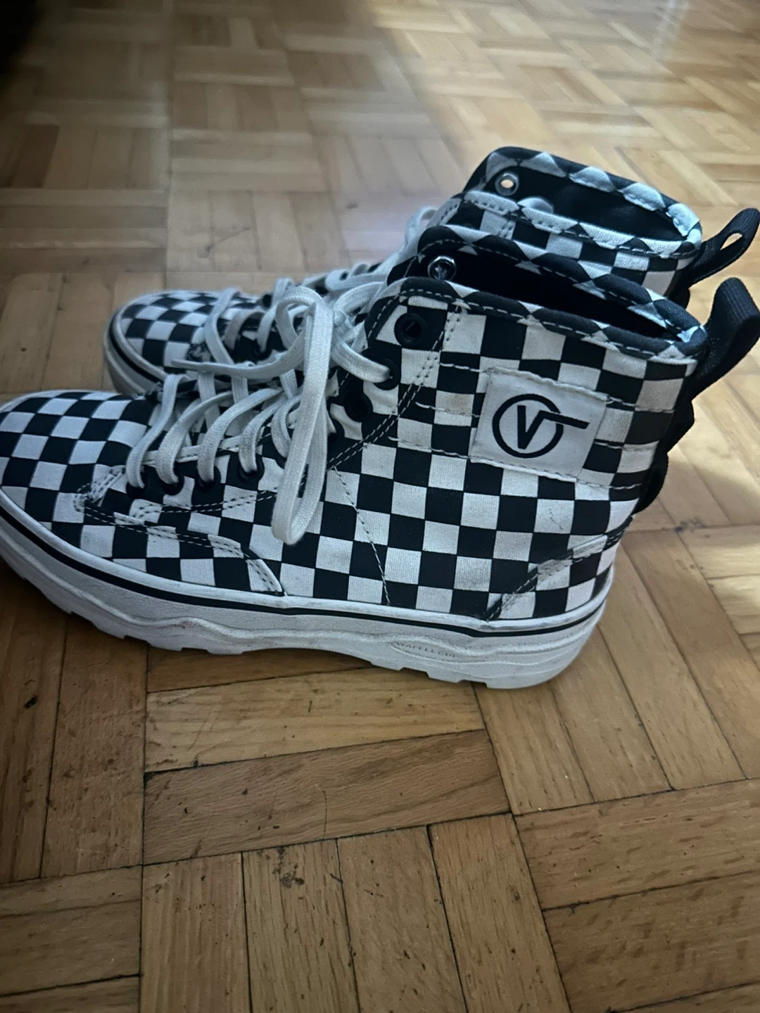 These Vans high-top shoes feature a classic checkerboard pattern in black and white. They have white laces and a durable rubber sole. Perfect for everyday wear!