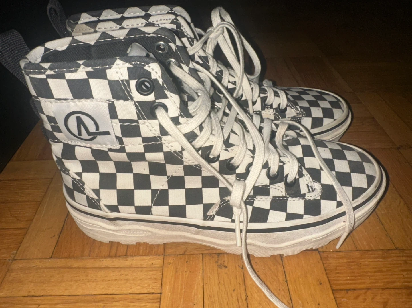 These Vans high-top shoes feature a classic checkerboard pattern in black and white. They have white laces and a durable rubber sole. Perfect for everyday wear!