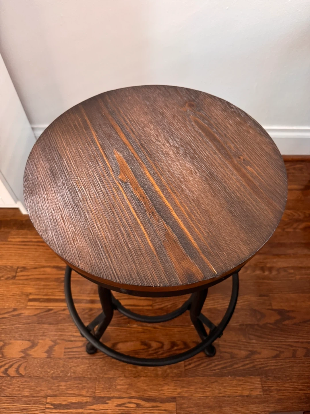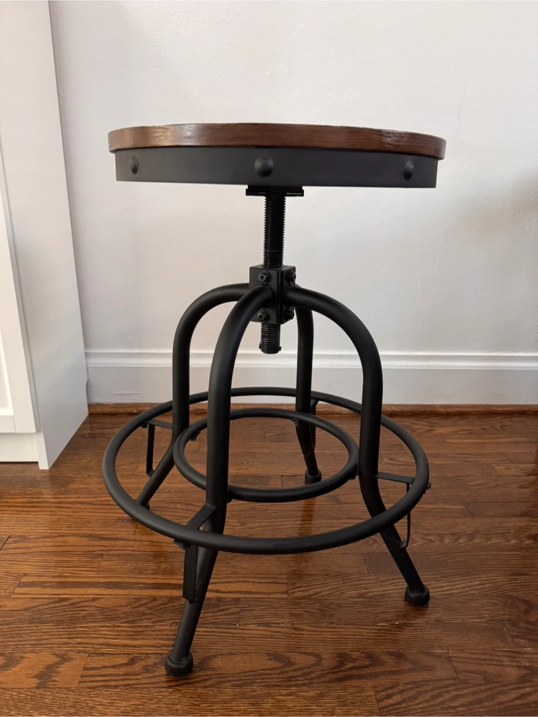 2 same adjustable swivel stools. A rustic wooden seat and a sturdy black metal base. It's perfect for a kitchen counter or bar area. The seat height is adjustable.