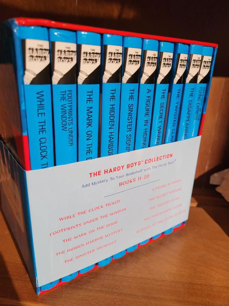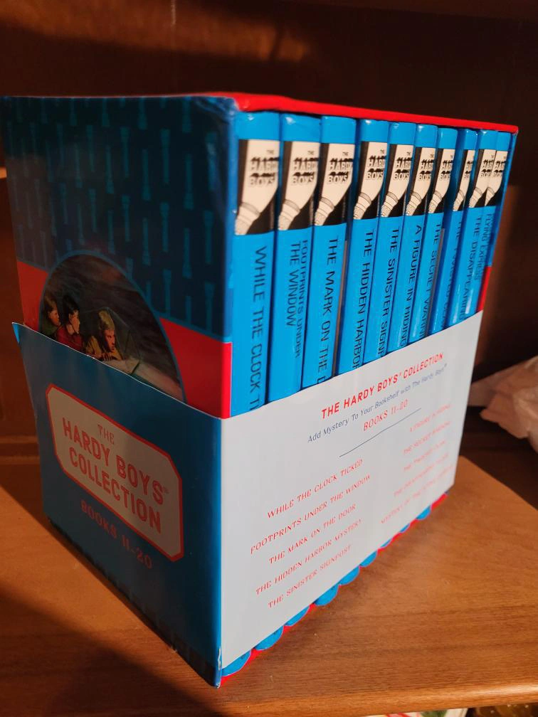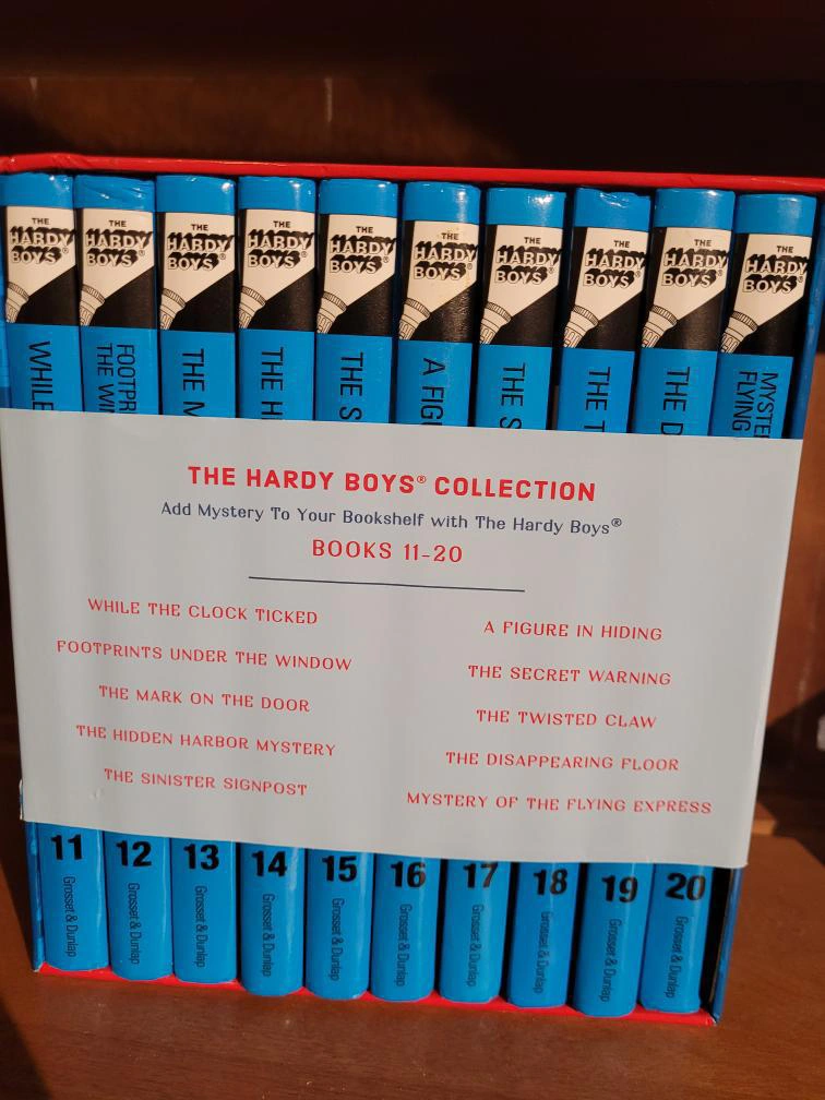 Set of 10 Hardy Boys books, numbers 11-20. Includes: While the Clock Ticked, Footprints Under the Window, The Mark on the Door, The Hidden Harbor Mystery, The Sinister Signpost, A Figure in Hiding, The Secret Warning, The Twisted Claw, The Disappearing Floor, Mystery of the Flying Express.