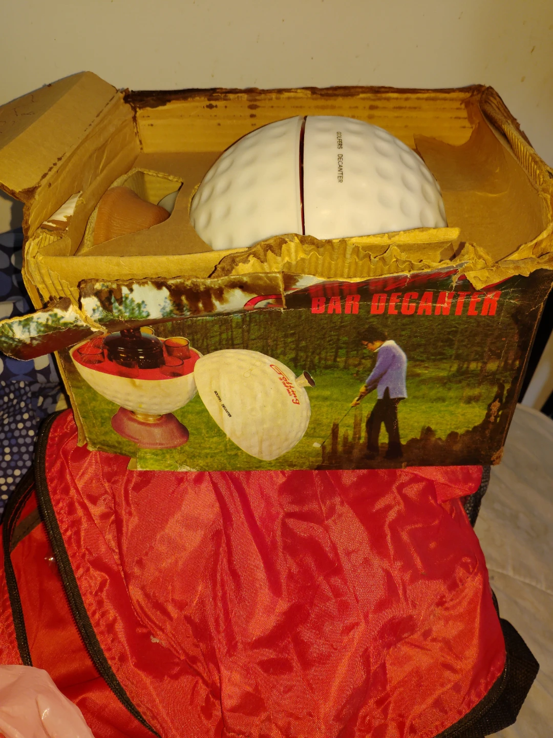 This is a unique bar decanter shaped like a golf ball. It's designed for serving drinks. It comes in its original box.