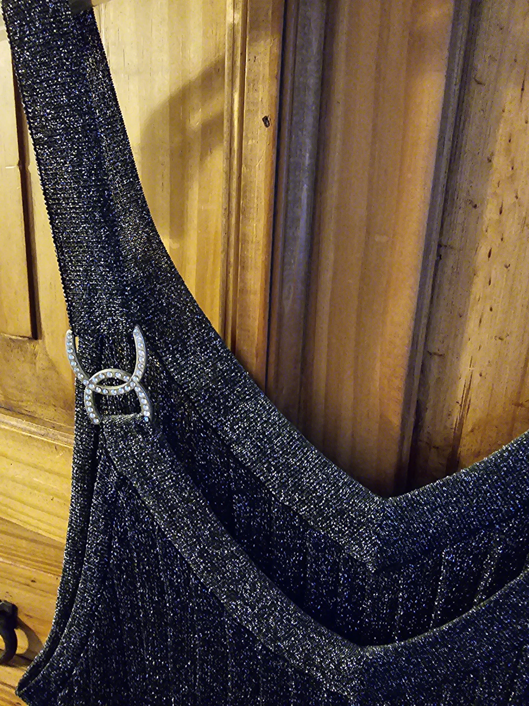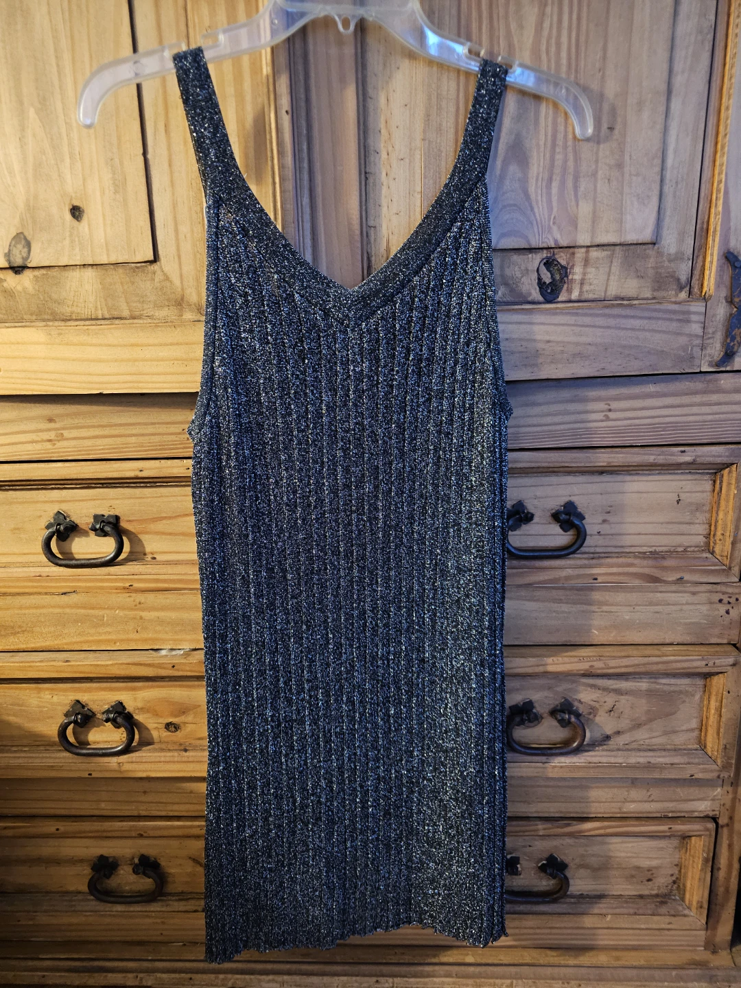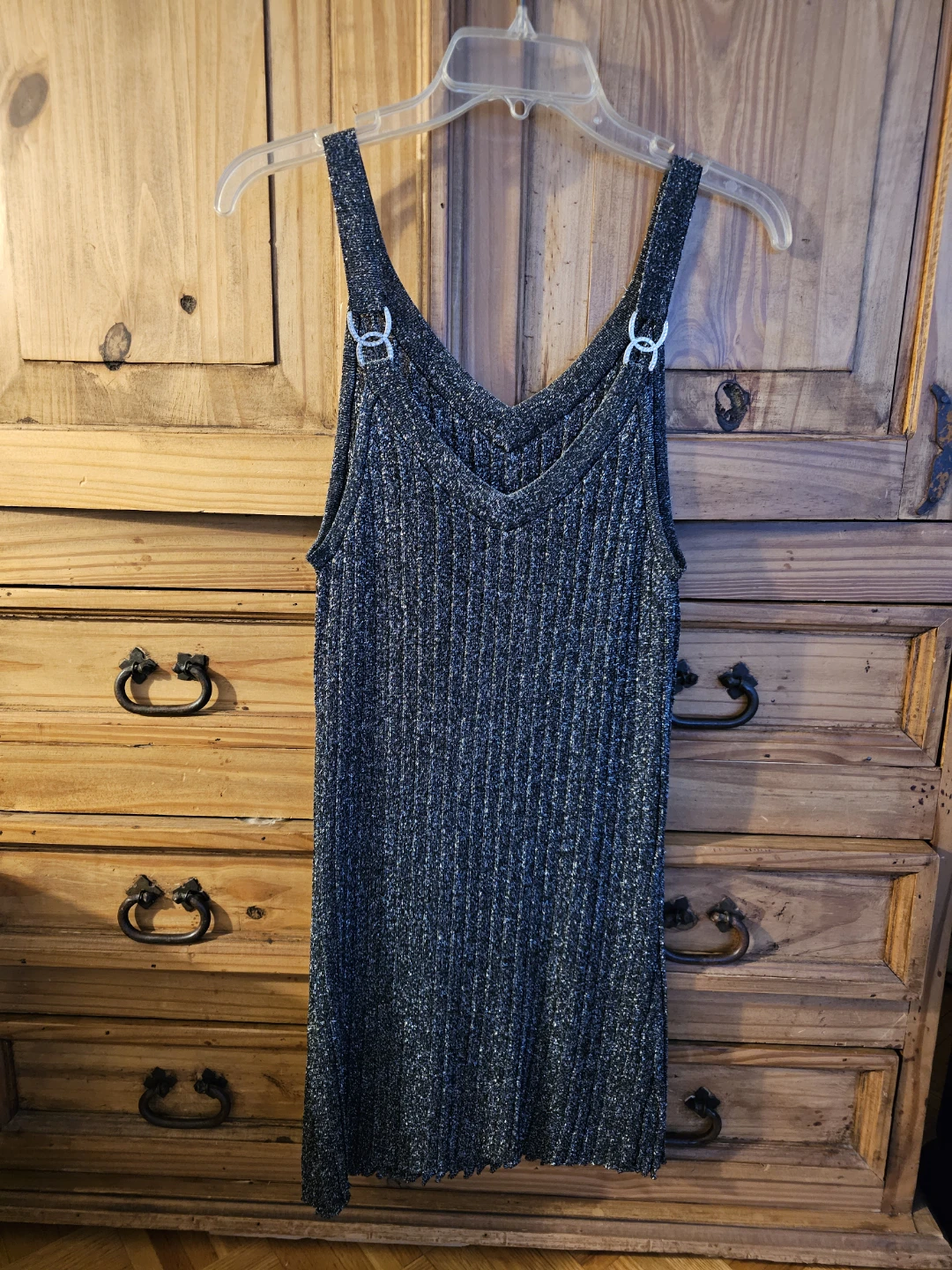 Here's a sparkly knit dress that's in great condition! It has a V-neck and decorative rings on the straps. It's perfect for a night out or a special occasion