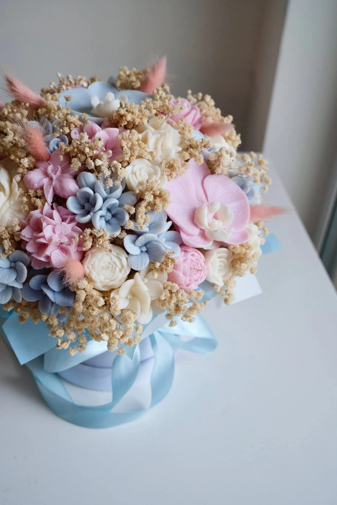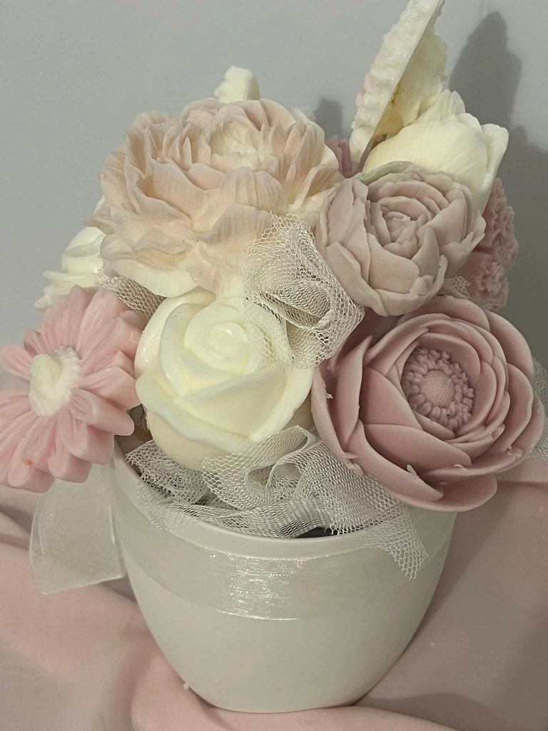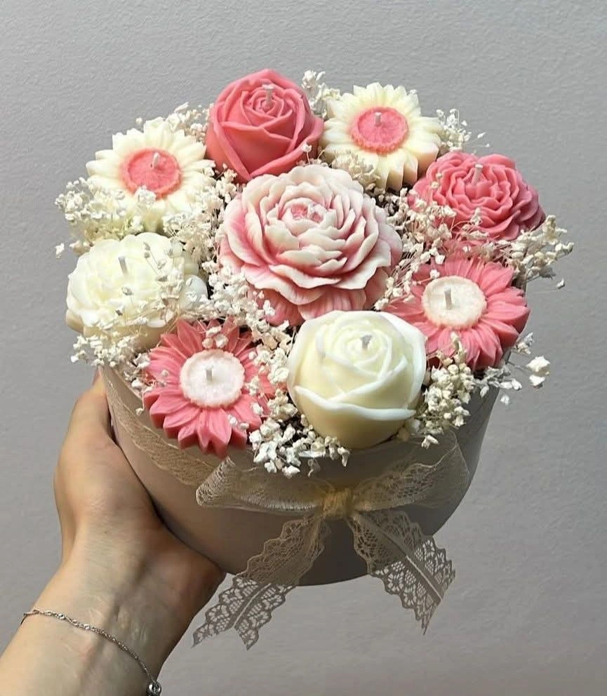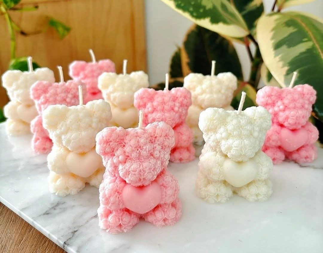 A lovely collection of handmade scented candles. These decorative pieces include beautifully crafted roses and adorable teddy bears holding hearts. They're perfect for adding a touch of charm to any space or as a thoughtful gift. Crafted from quality wax with delicate scents.
