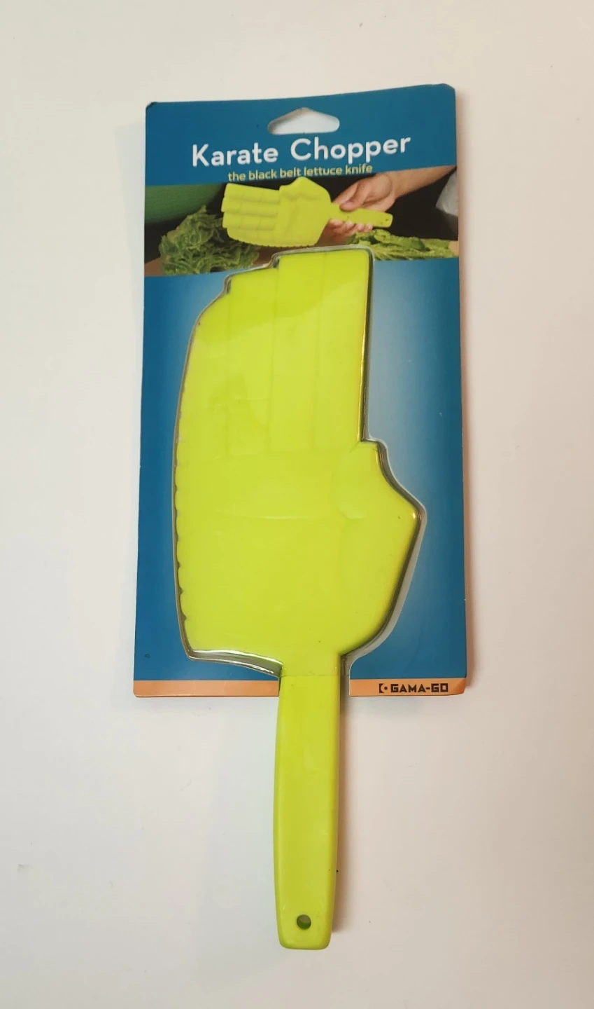 While some karate experts can slice through concrete blocks with one chop, ours has a black belt in lettuce slicing and, being plastic, he’ll leave no brown edges behind.