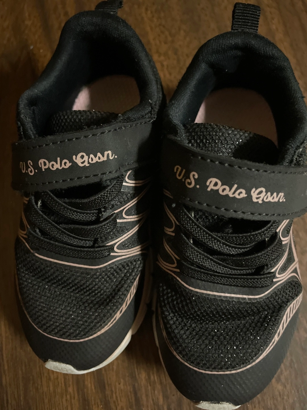 I'm selling a pair of U.S. Polo Assn. athletic sneakers. They are black with pink accents and have a velcro strap. Great for active kids!