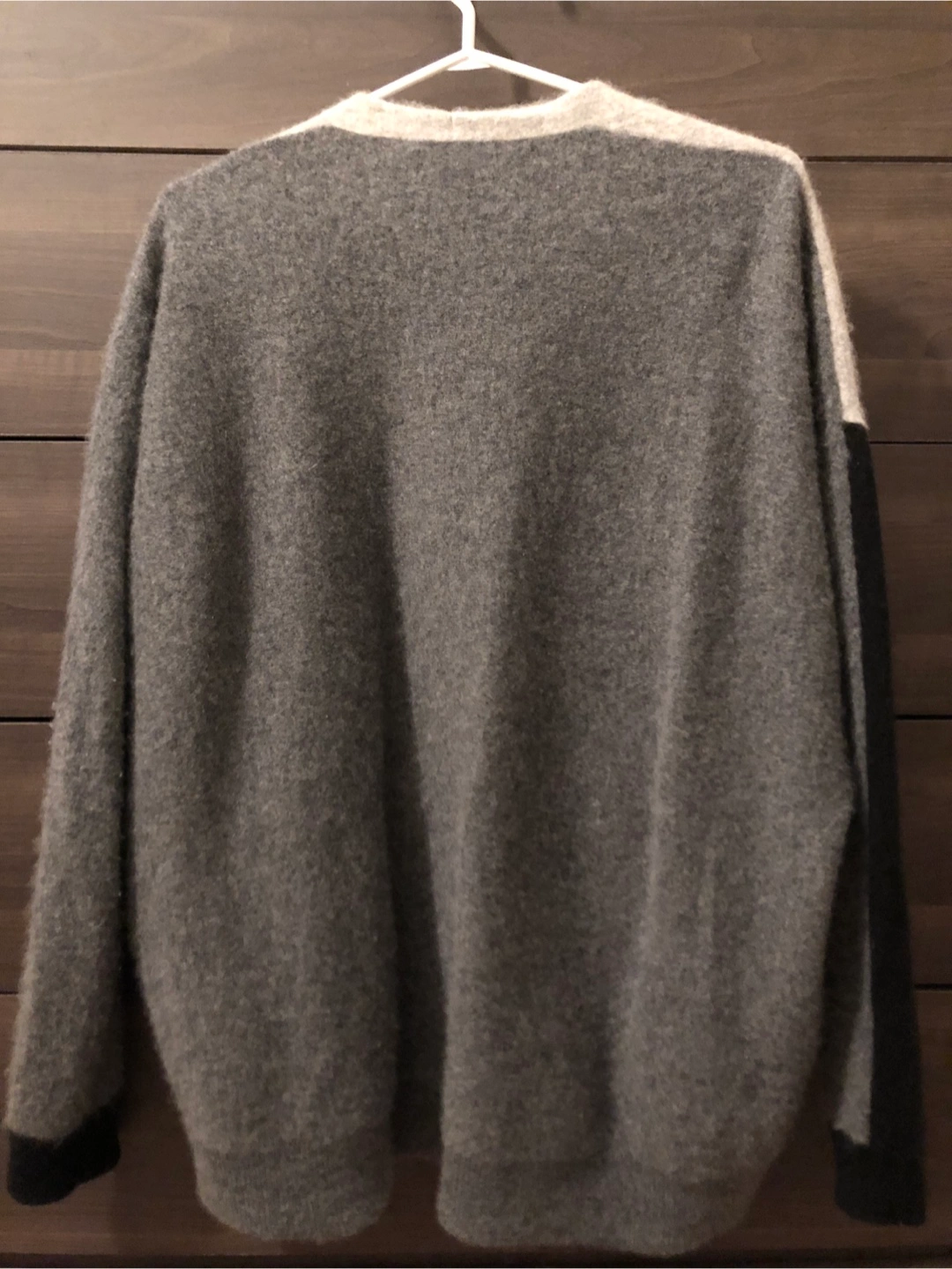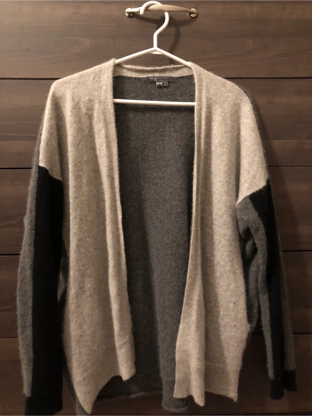 Here's a Vince cardigan in size M! It's a stylish grey colour with black accents on the sleeves. Perfect for layering or adding a touch of warmth to any outfit 100% cashmere.