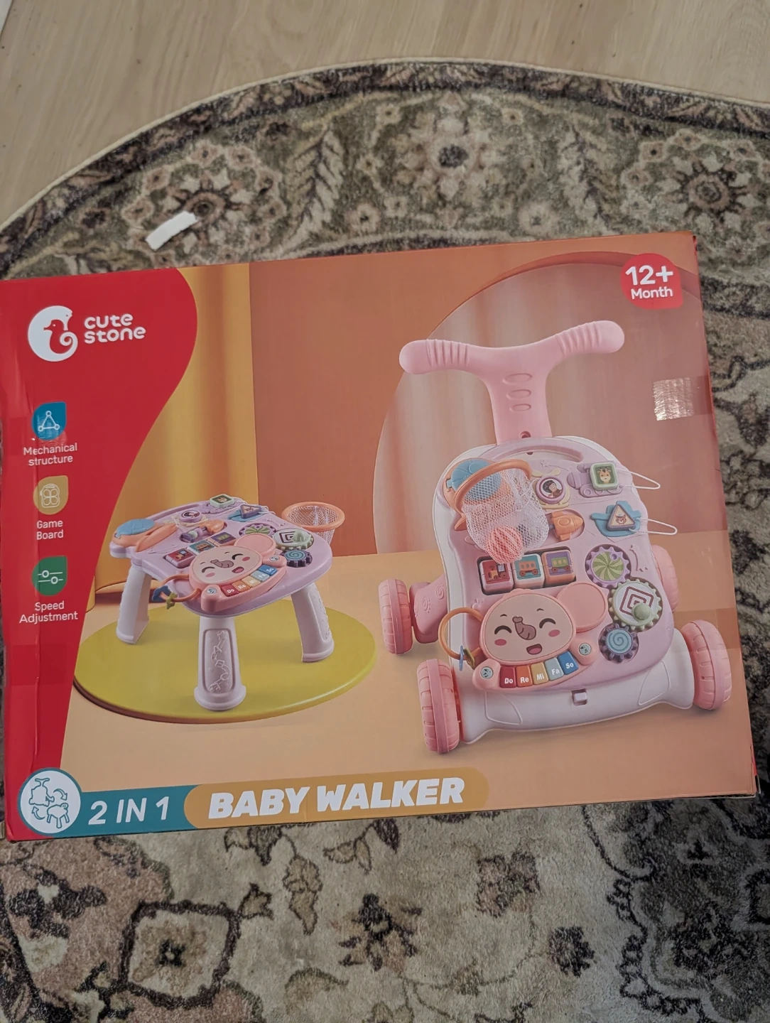 This is a Cute Stone 2-in-1 baby walker with a mechanical structure and game board. It also features speed adjustment. Recommended for ages 12+ months.