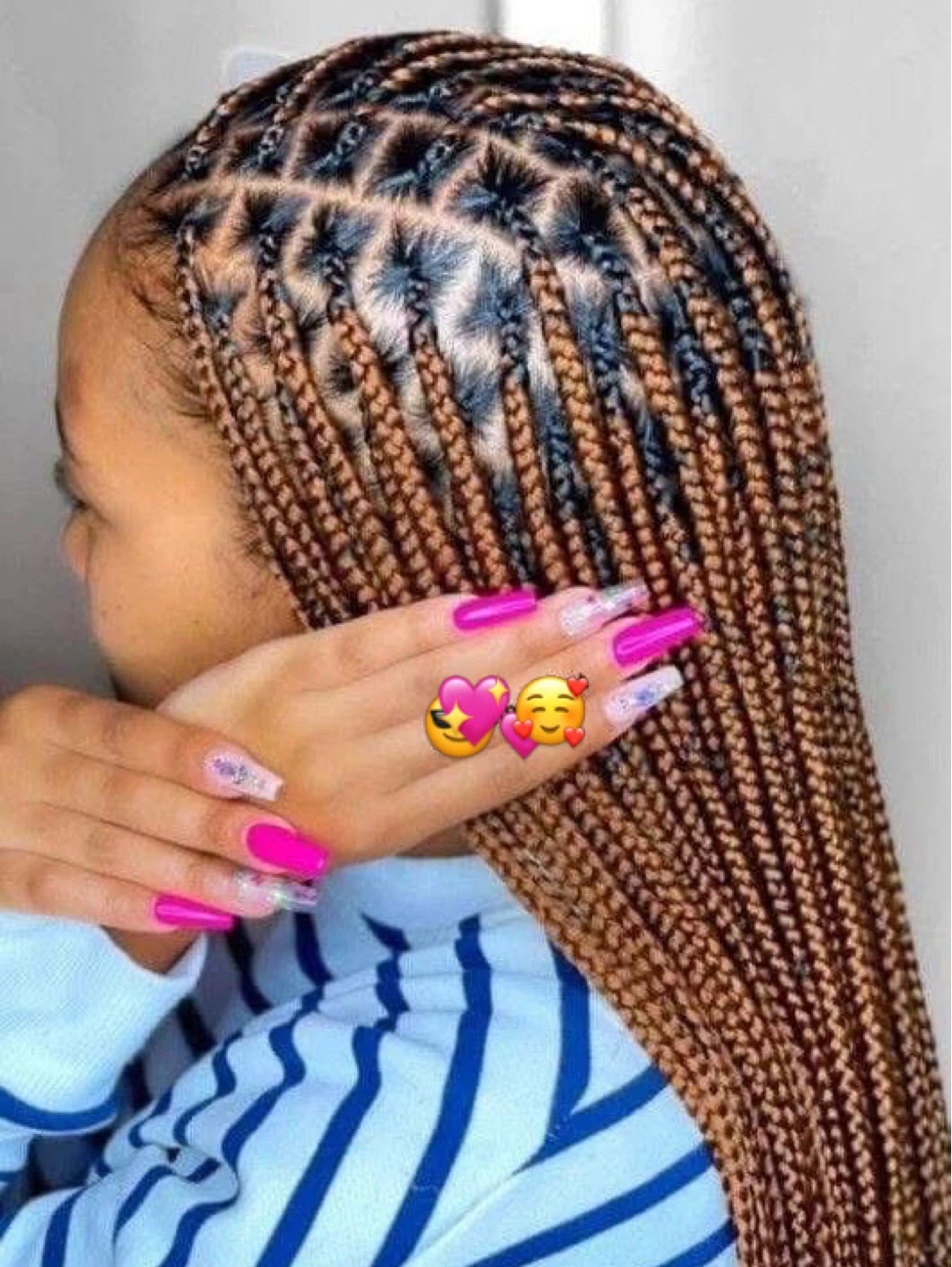 These are braided hair extensions featuring a mix of brown and black colours. They're expertly crafted for a natural look and feel. The braids are done in a box pattern, offering a stylish and durable hairstyle. Perfect for those looking to add length and volume!
