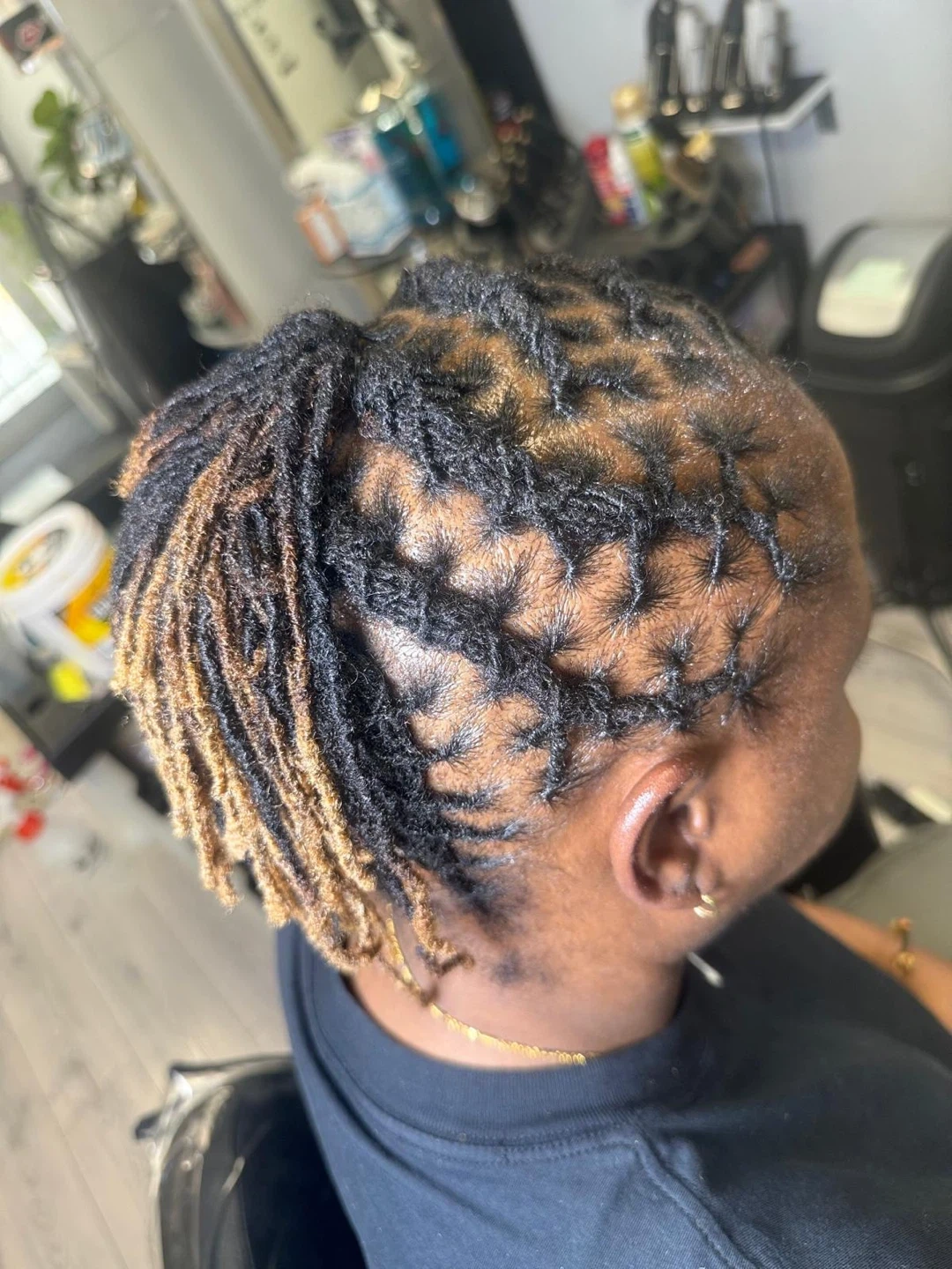 These are braided hair extensions featuring a mix of brown and black colours. They're expertly crafted for a natural look and feel. The braids are done in a box pattern, offering a stylish and durable hairstyle. Perfect for those looking to add length and volume!