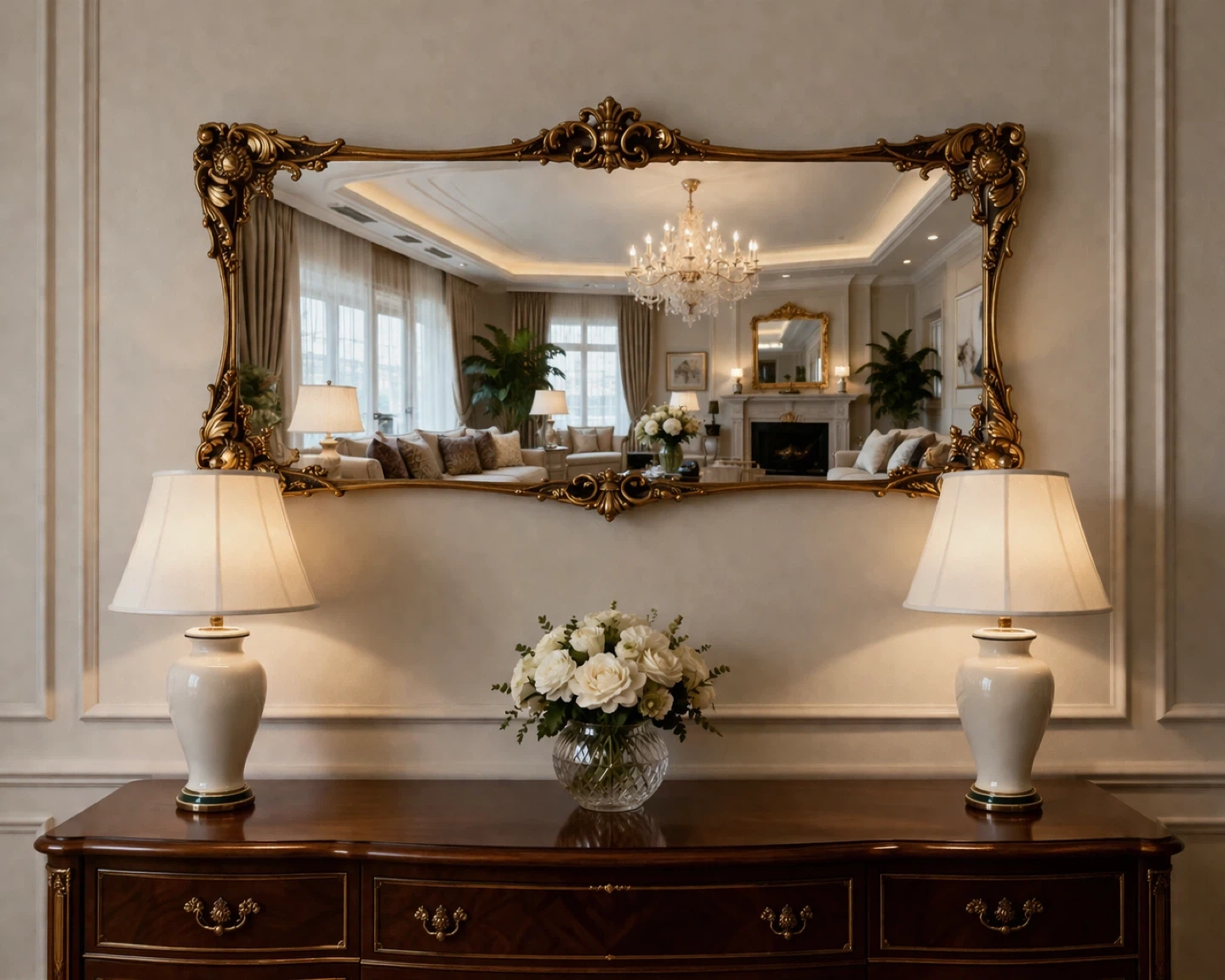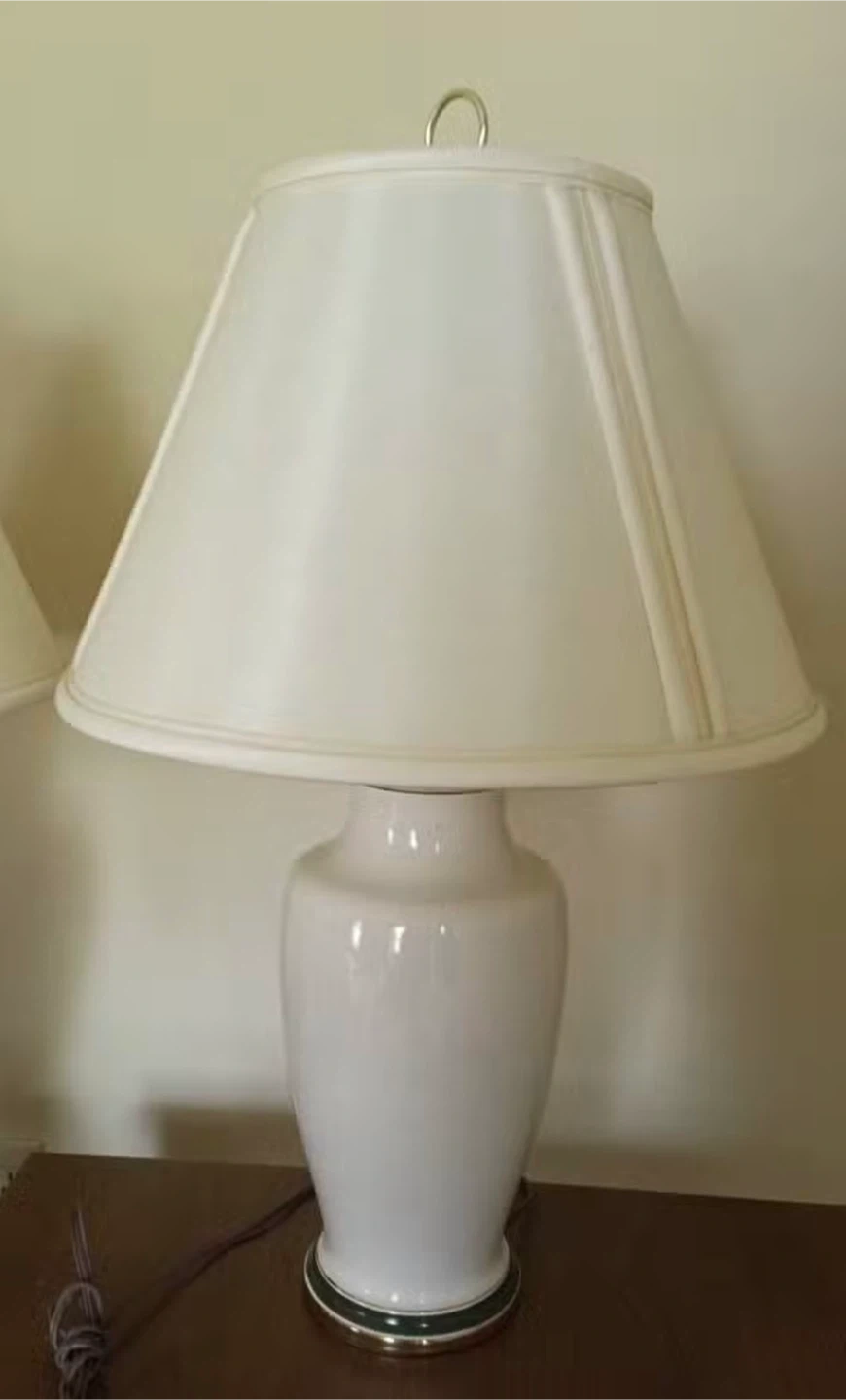 This is a white ceramic table lamp with a cream-coloured shade. It has a dark green band around the base with gold trim. It's a classic design that'll fit any room. Creates a warm ambiance.