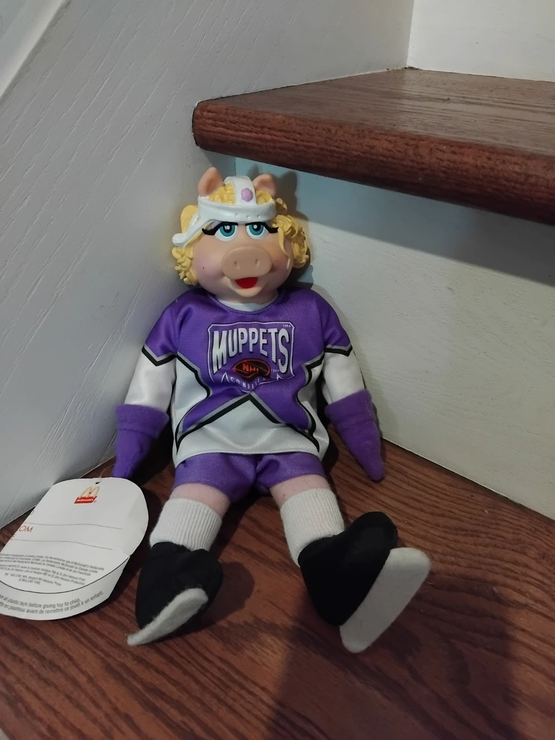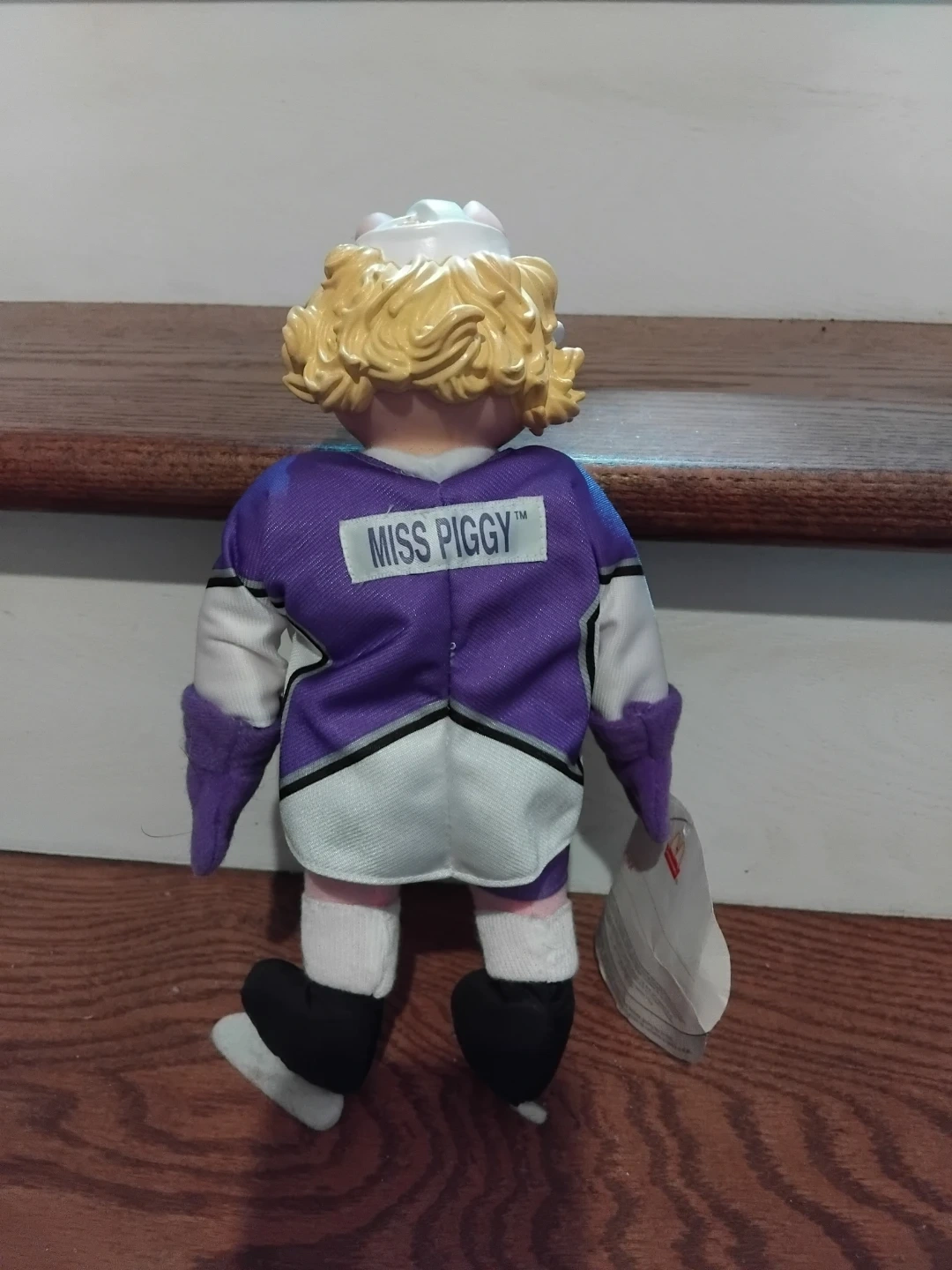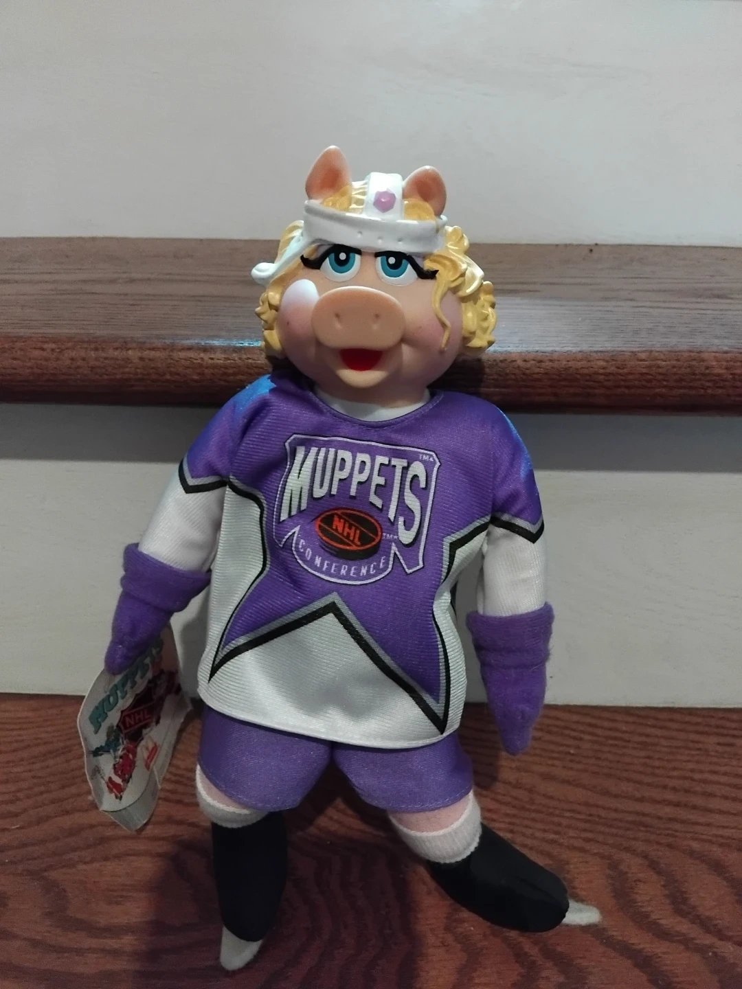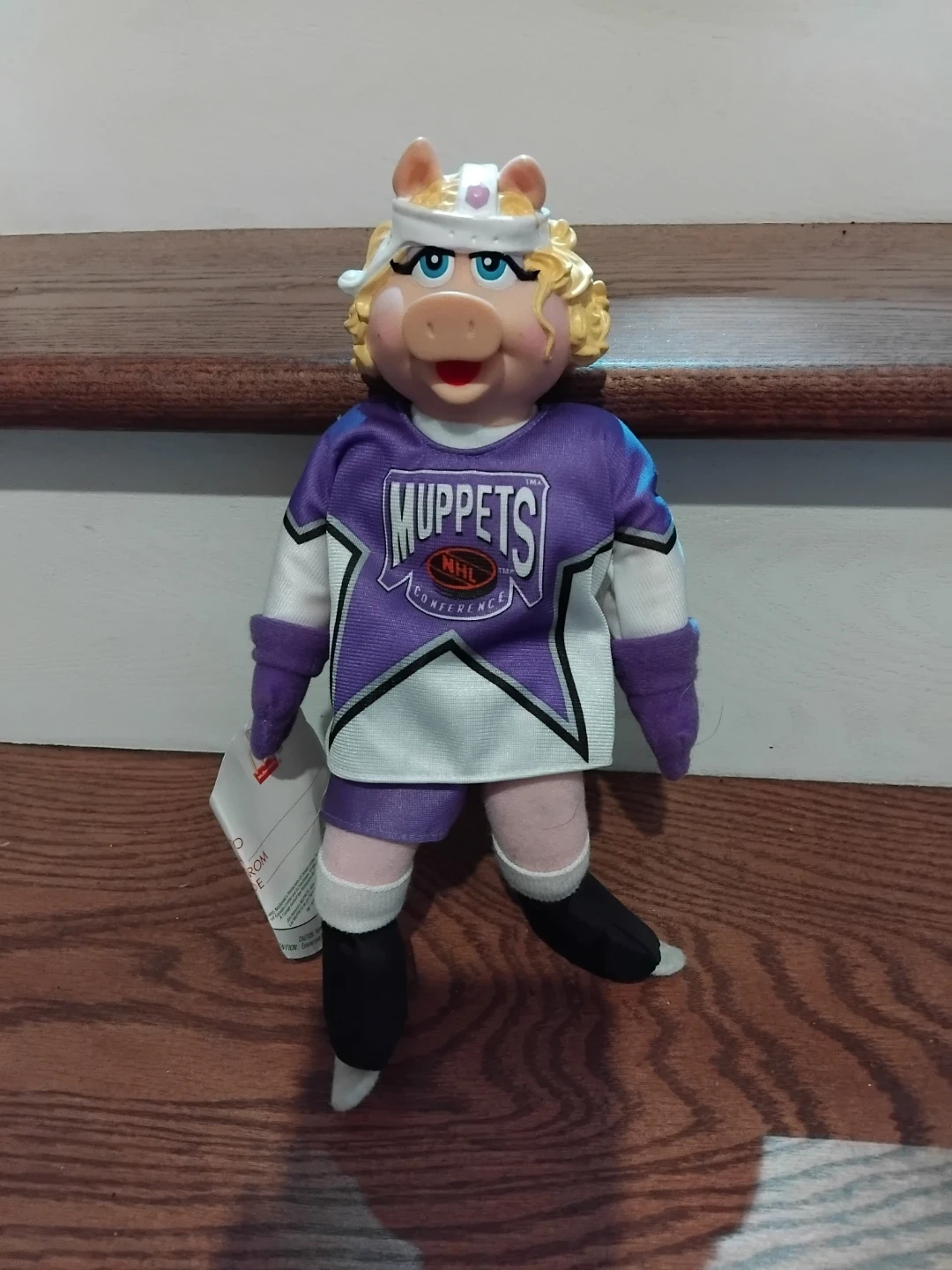 This is a Miss Piggy plush doll dressed in a Muppets NHL Conference hockey jersey. It features the Muppets logo on the front and "MISS PIGGY" on the back. The doll is wearing a purple and white hockey uniform with matching shorts and gloves. Perfect for any Muppets or hockey fan!