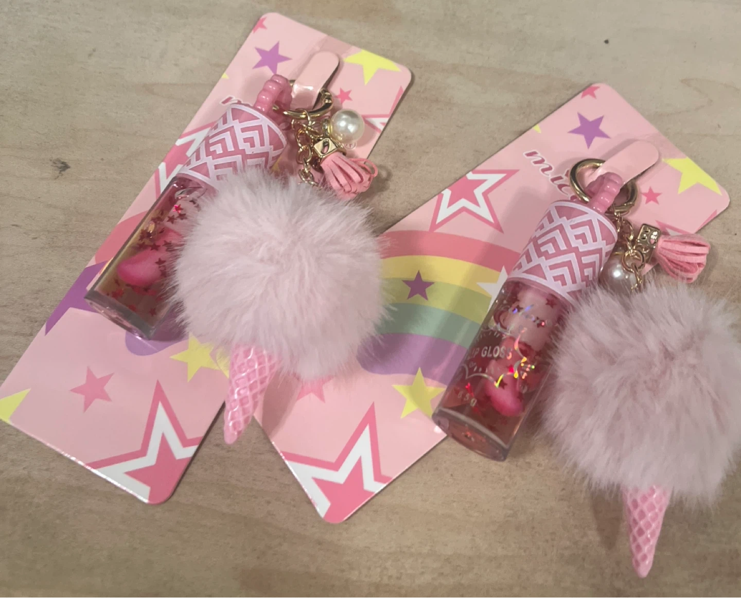 Brand new and super cute pink lip gloss keychain! It's got a little pompom and ice cream cone charm, perfect for adding a touch of fun to your keys or bag