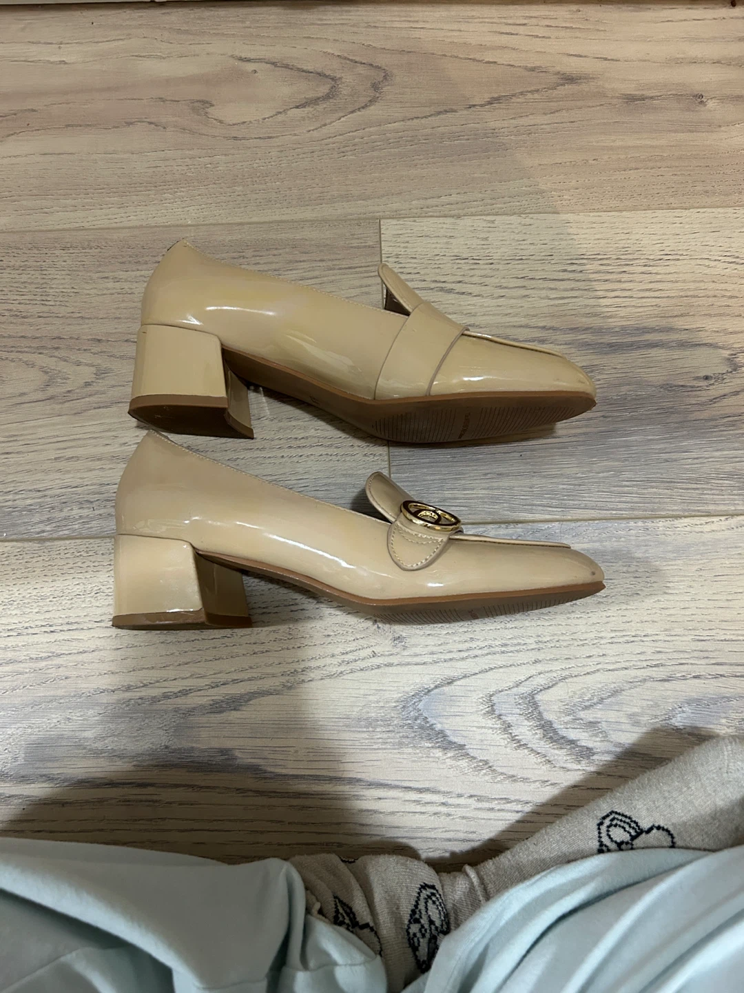 These are patent leather loafers from The Wishbone Collection. They feature a gold-tone hardware detail on the vamp. The heel height is approximately 1.5 inches.