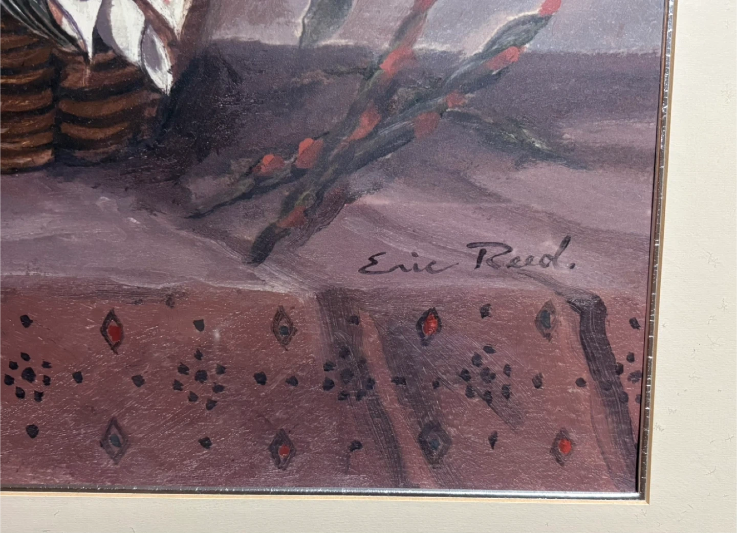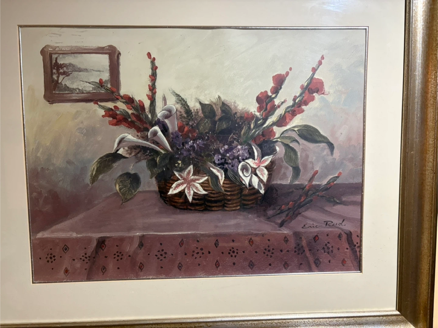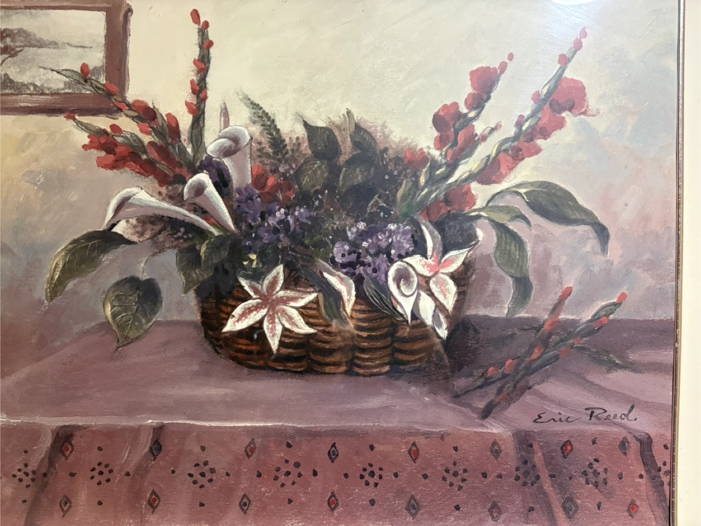 This is a framed painting depicting a floral still life in a basket. The artwork shows a variety of flowers including lilies and others in shades of red, purple, and white. It's framed in a silver-toned frame with a matboard. The artist's signature is Eric Reed on the lower right.