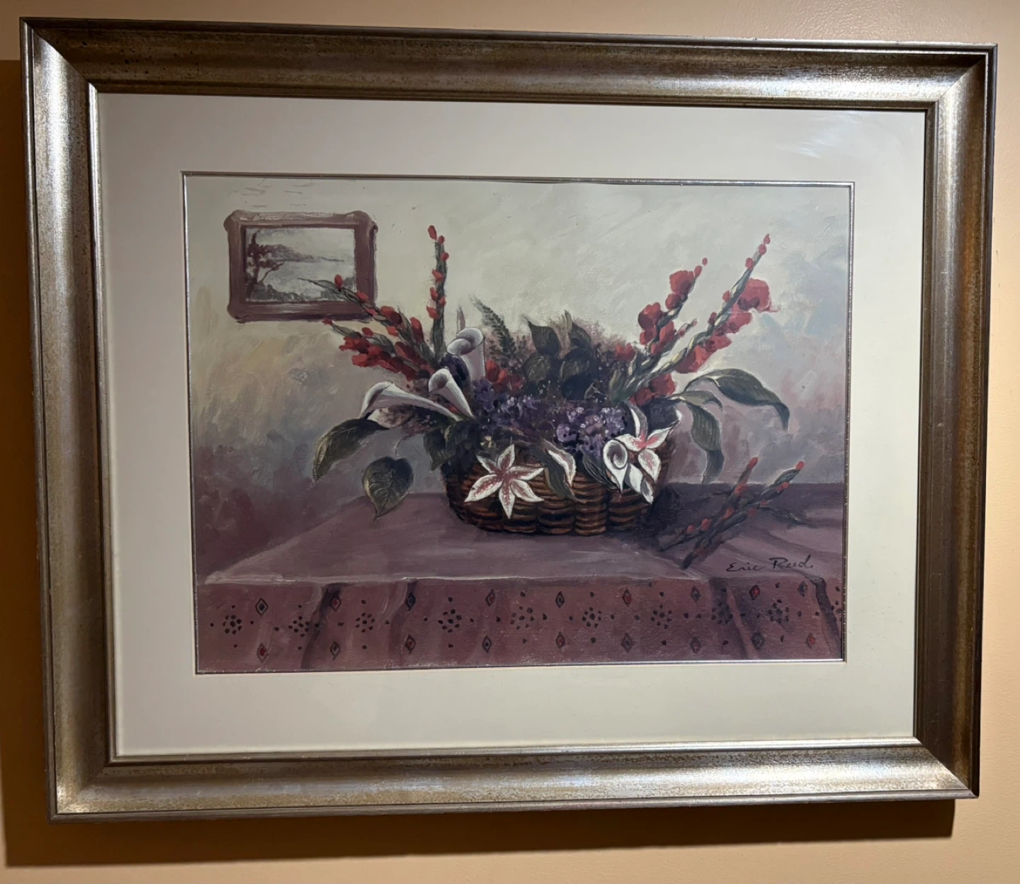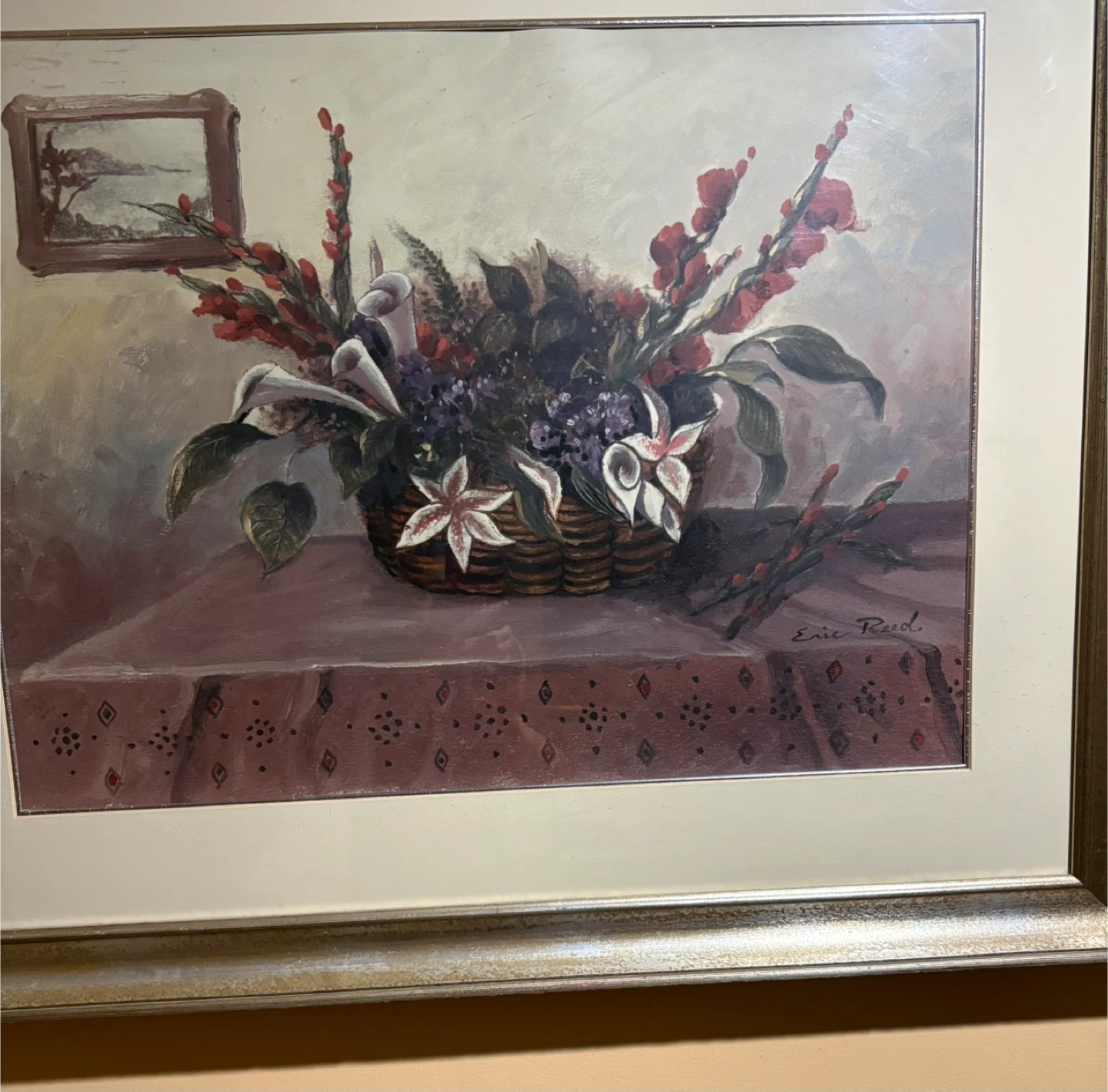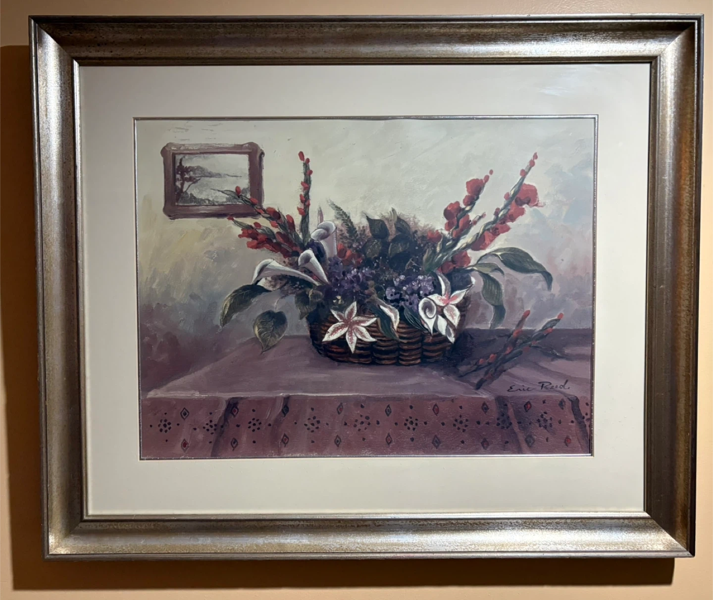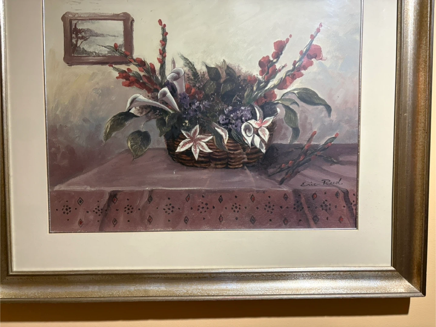 This is a framed painting depicting a floral still life in a basket. The artwork shows a variety of flowers including lilies and others in shades of red, purple, and white. It's framed in a silver-toned frame with a matboard. The artist's signature is Eric Reed on the lower right.