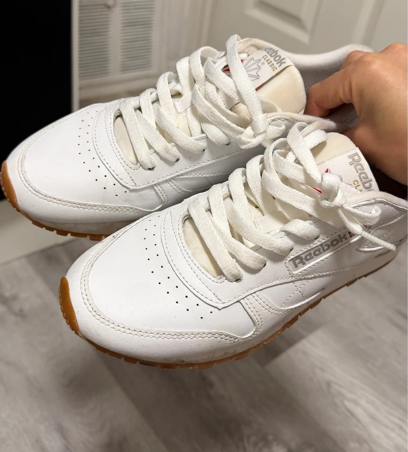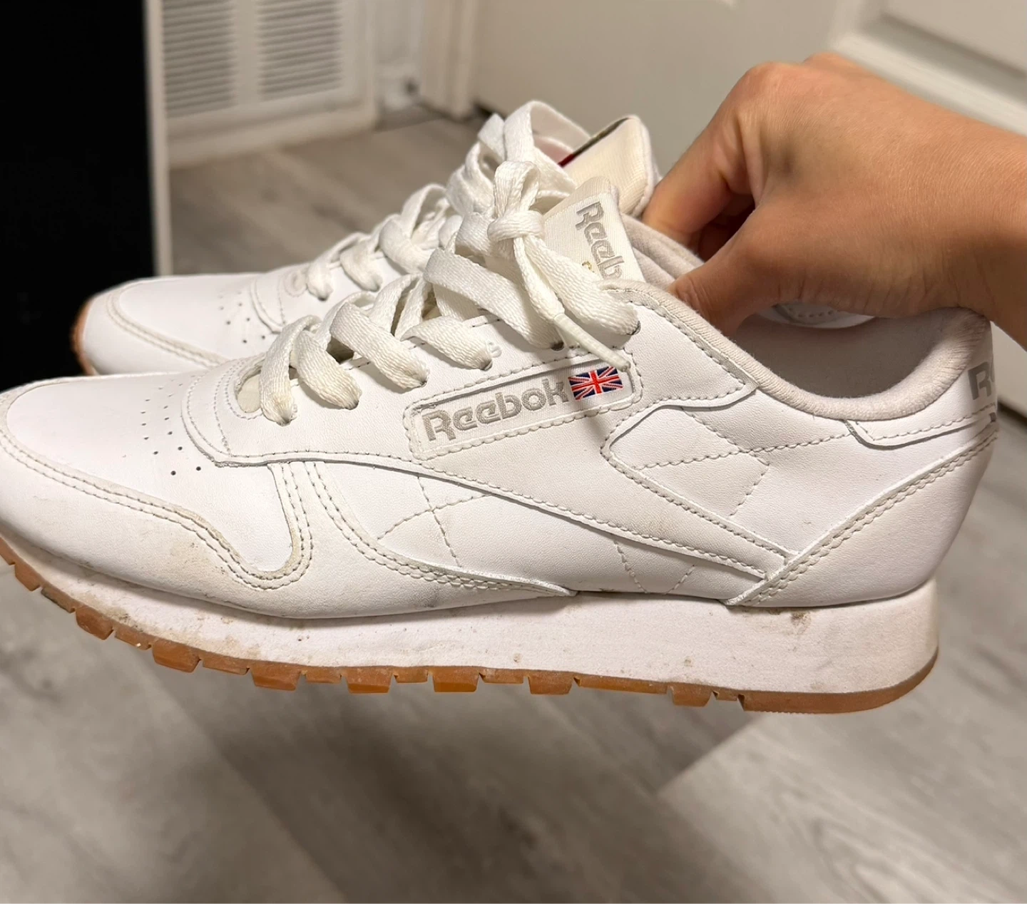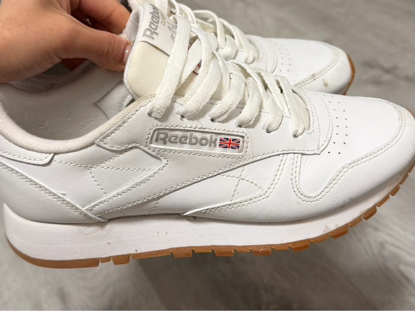 Classic white Reebok sneakers with a gum sole. These are a size 6/6.5 Comfortable and stylish for everyday wear.