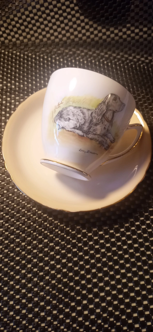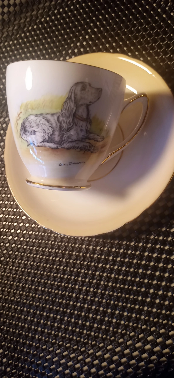 This is a Shelley Fine Bone China tea cup and saucer from the 1930s. It features a painted dog design and gold trim. There was 4 styles made and this is the number 2. Very limited set. The cheapest I have seen it is $700. and I'm not kidding. Please research for yourself! It's a lovely addition to any tea collection! In like new condition.