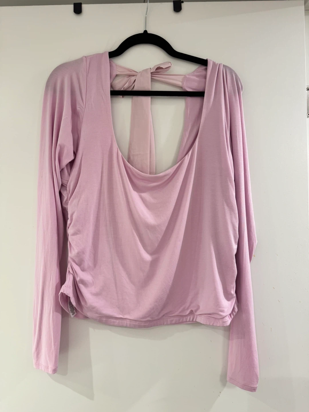 This is a cute pink long-sleeve top from Blogilates. It features ruching on the sides and a tie-bow detail at the back. Made from a blend of polyester and spandex for comfort.