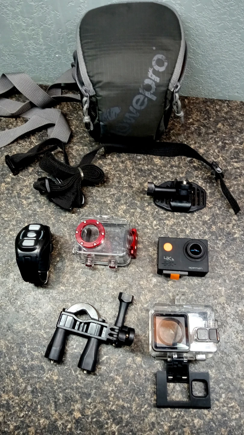 This Apeman action camera captures video in 4K resolution. It comes with a waterproof case, a remote control, a mount, and a Lowepro carrying bag. Perfect for capturing adventures!